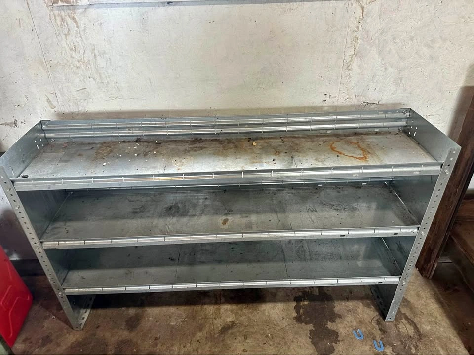 Sturdy galvanized steel shelf unit, perfect for garage, workshop, basement, or warehouse storage. Dimensions: • Depth: 14” • Length: 60 3/8” • Height: 37” 3 shelves The shelf is solid and durable, with some cosmetic wear and light rust in spots, but still in great working condition. Ideal for tools, parts, bins, or general storage.