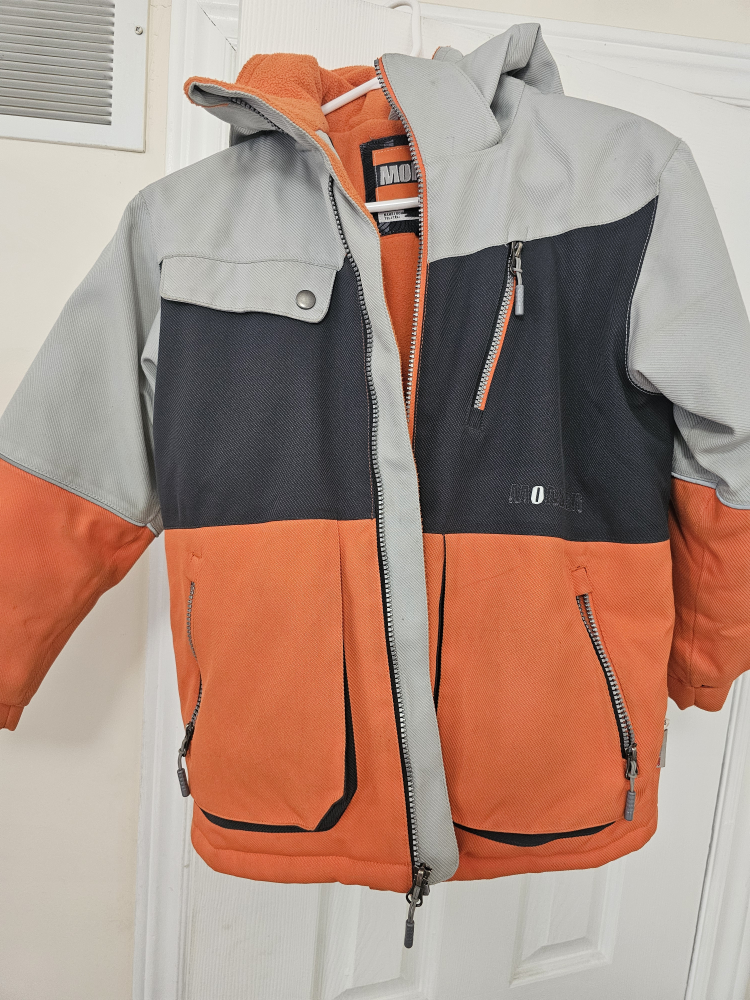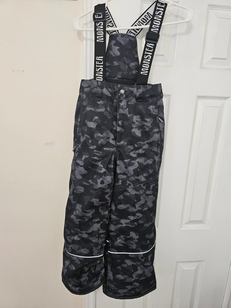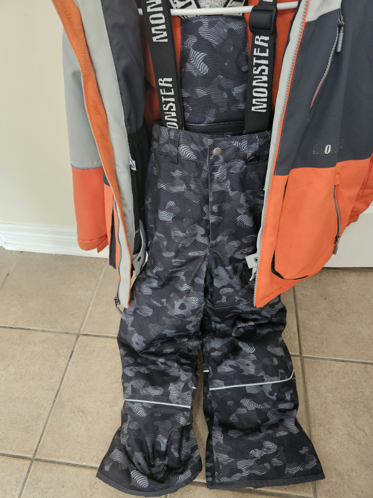 Selling a super cool Monster brand snow gear set! It includes both the jacket and the pants. The jacket is a mix of grey, black, and orange, while the pants are a stylish black and grey camo pattern. Perfect for hitting the slopes or just playing in the snow!
