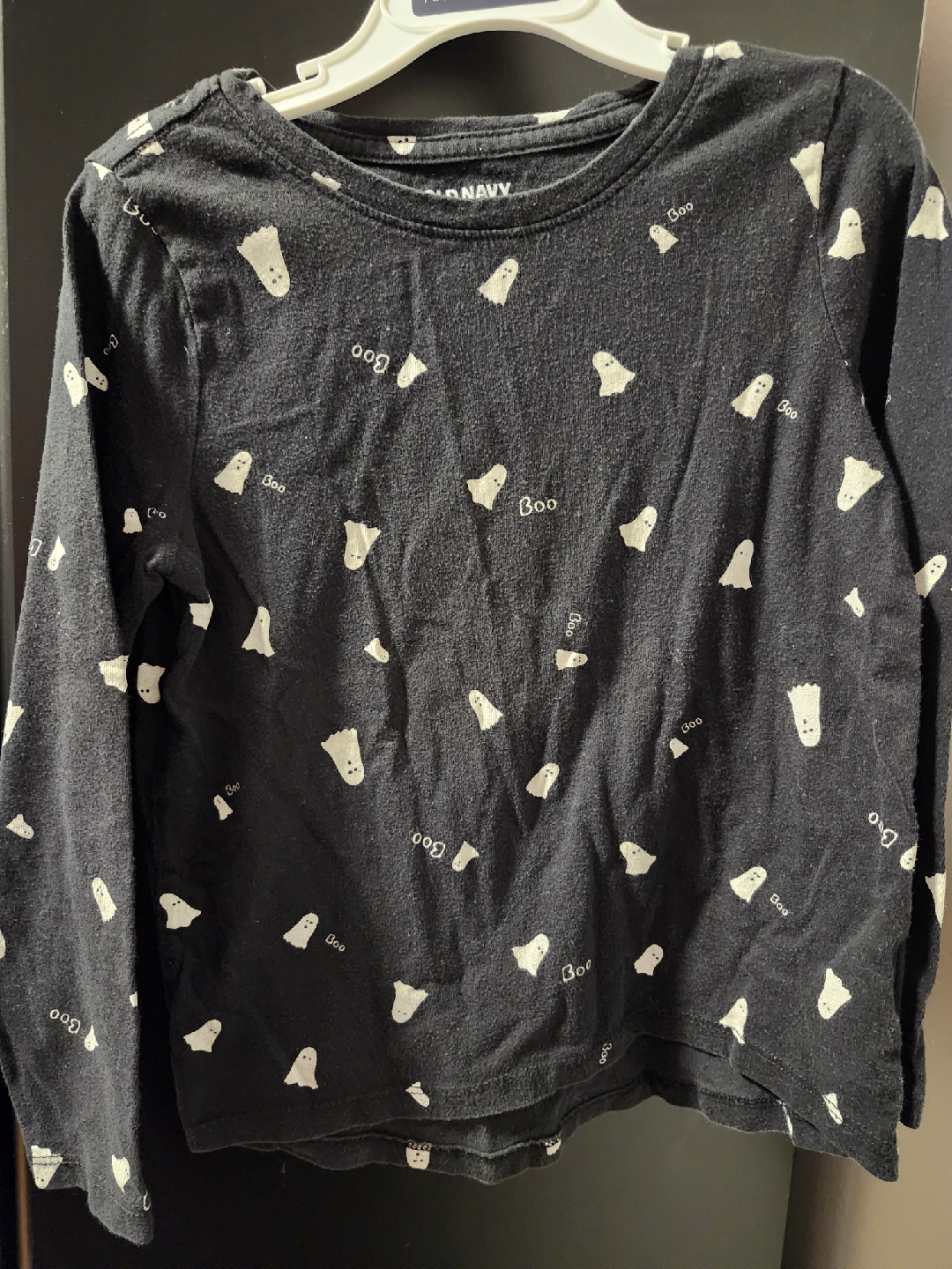 giving away a cute Old Navy long-sleeve tee for kids! It's a size small (6-7). The shirt is black with a fun ghost pattern and the word "Boo" printed all over it.