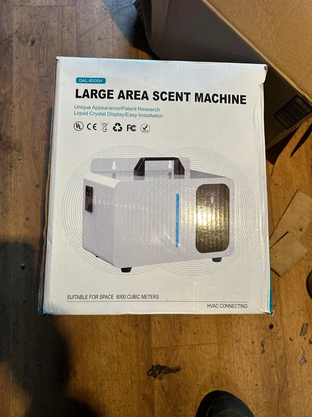 Selling a GAL-8000H large area scent machine. It's designed for spaces up to 8000 cubic meters and connects to HVAC systems. It has a unique appearance with a liquid crystal display and easy installation. Comes with the user manual