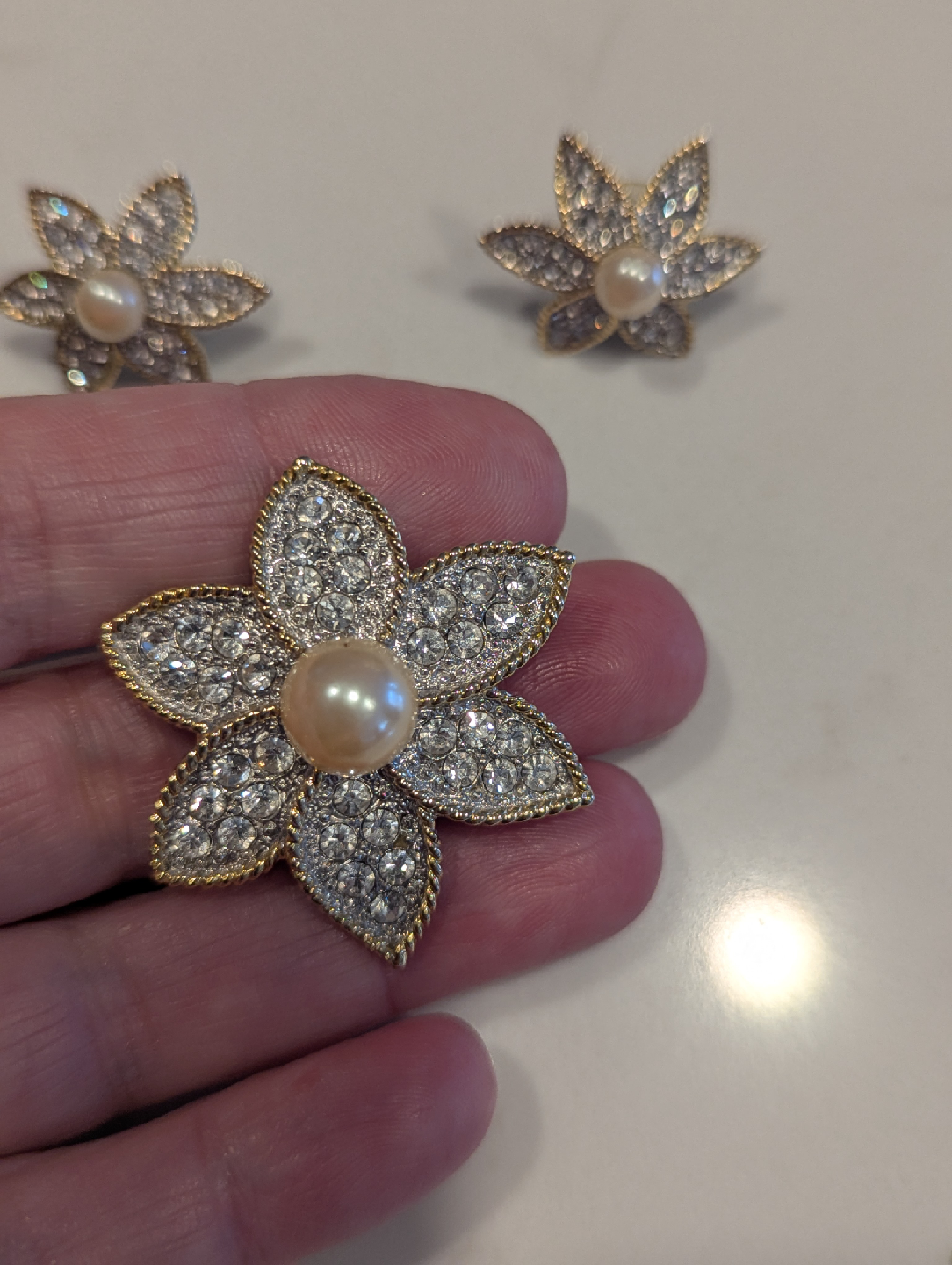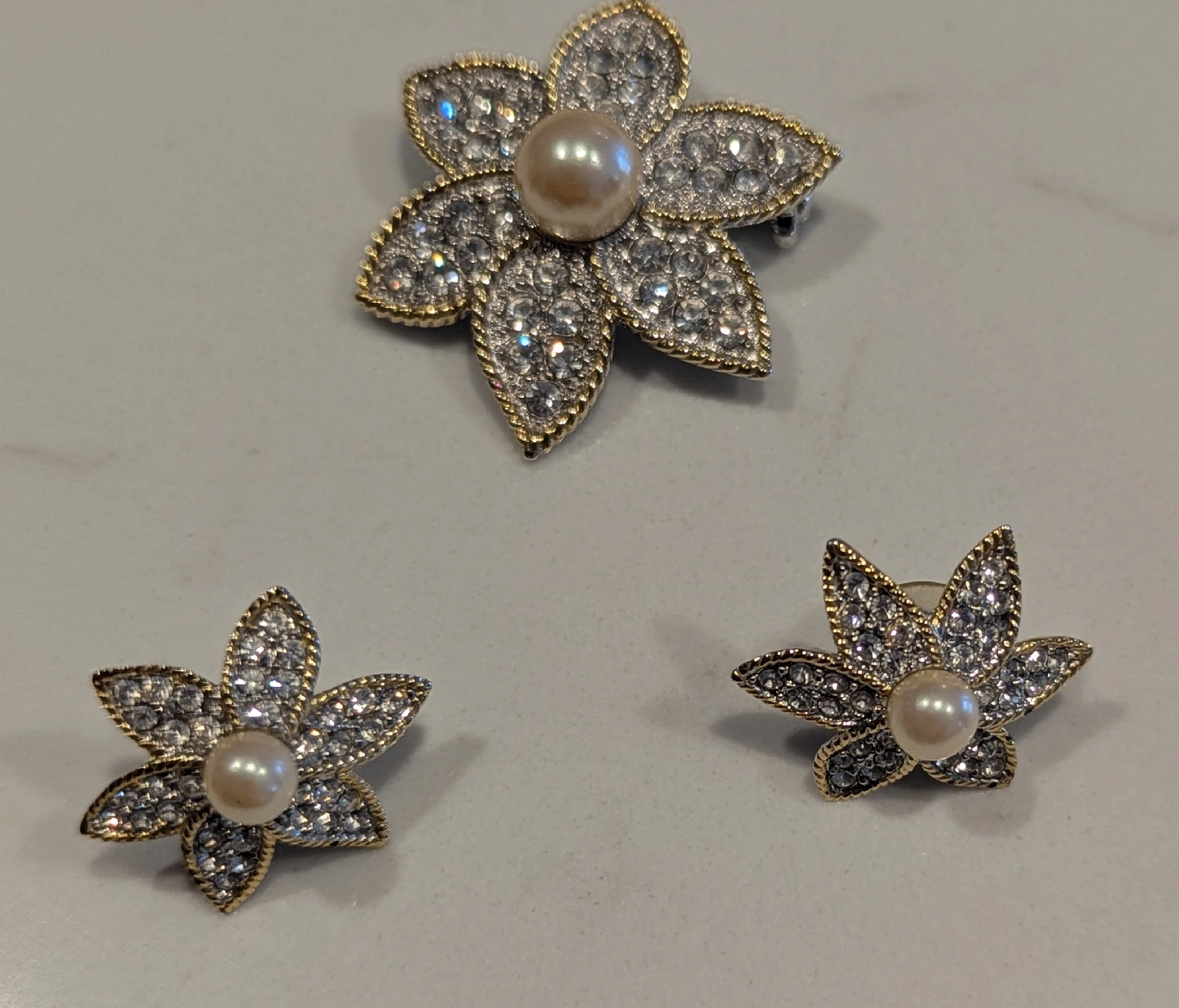 Selling a beautiful flower-shaped brooch and matching earrings set. The set features rhinestones and a faux pearl in the center. Perfect for adding a touch of sparkle to your day!