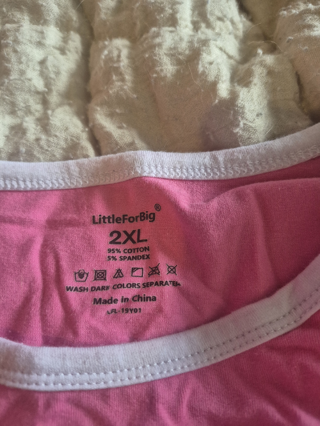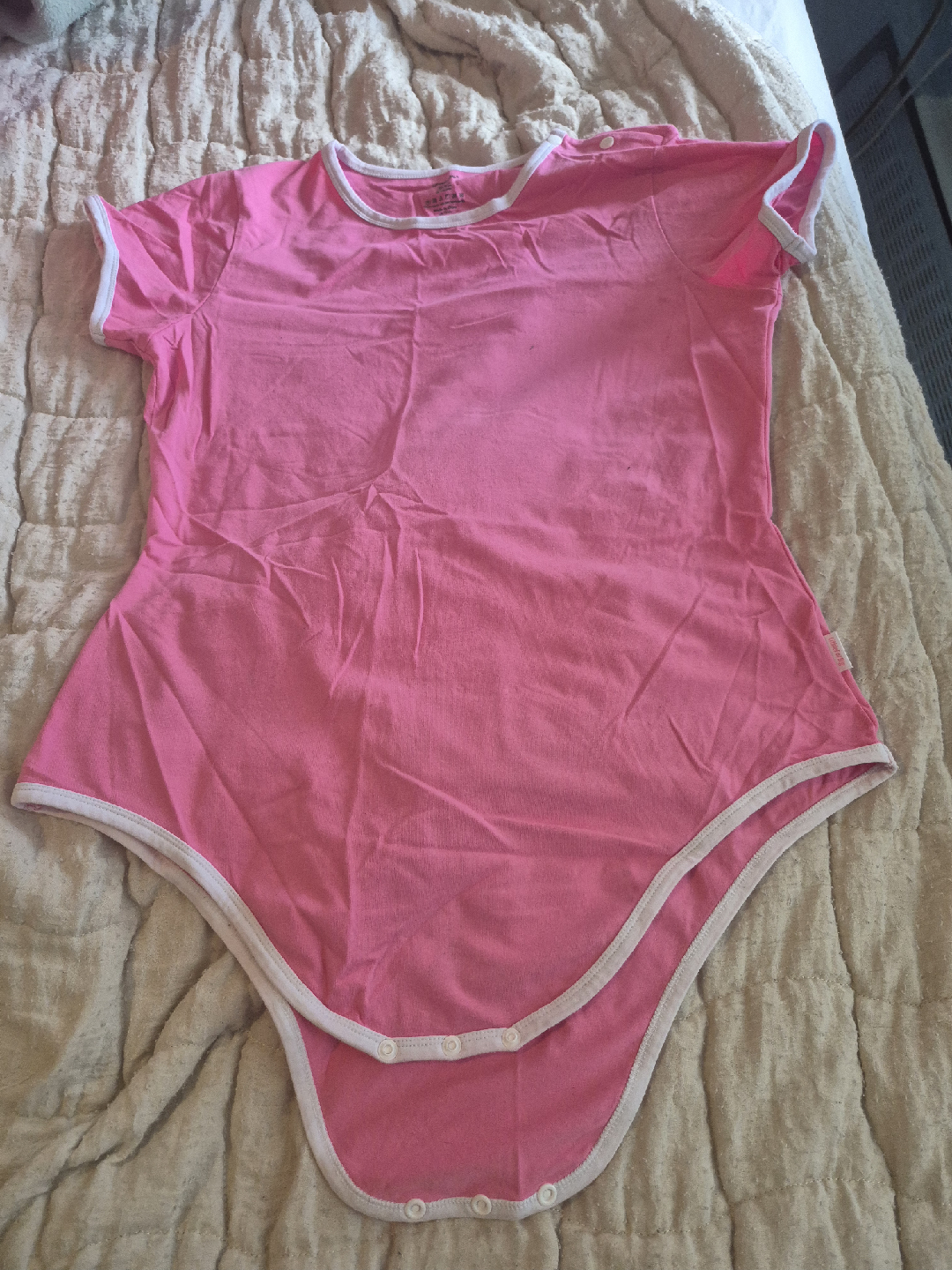 Selling a LittleForBig pink bodysuit in size 2XL. It's made of 95% cotton and 5% spandex. The care instructions say to wash dark colours separately. It's in great condition and ready for a new home