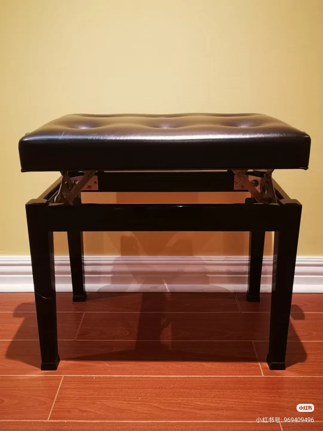 Selling a black adjustable piano bench in good condition. It's a sturdy and comfortable bench, perfect for practicing or performing. The bench has a padded seat and a solid frame. It would be a great addition to any piano setup!