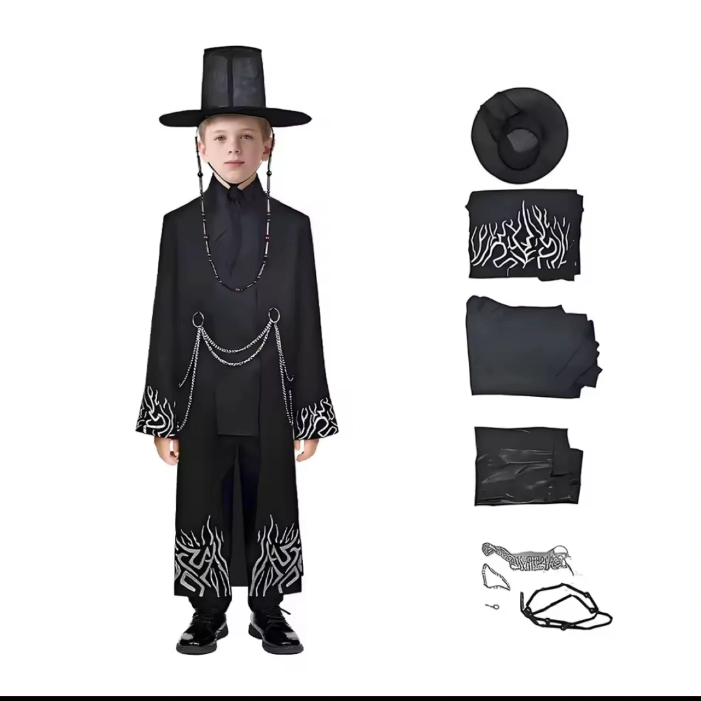 Brand new!!!! Selling a Saja boys demon form Halloween costume for kids. It includes a large hat, a long jacket, and pants. The costume is black with silver accents and chain details. Perfect for dress-up or Halloween!