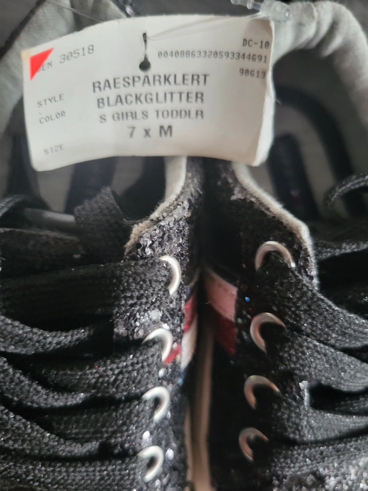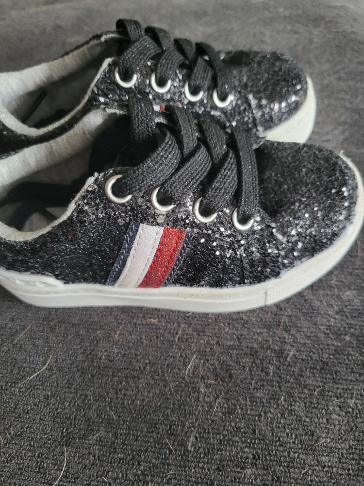 These adorable Tommy Hilfiger sneakers are perfect for your little one! They feature a stylish black glitter design with the classic Tommy Hilfiger stripe. Size 7 toddler, new