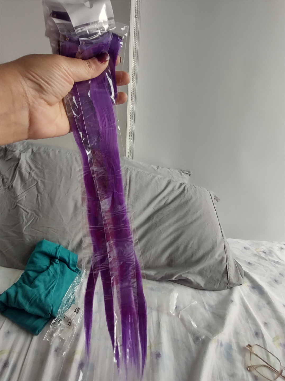 Purple clip-in hair extensions. They're perfect for adding a pop of colour to your hair without any commitment. Great for themed parties or halloween!