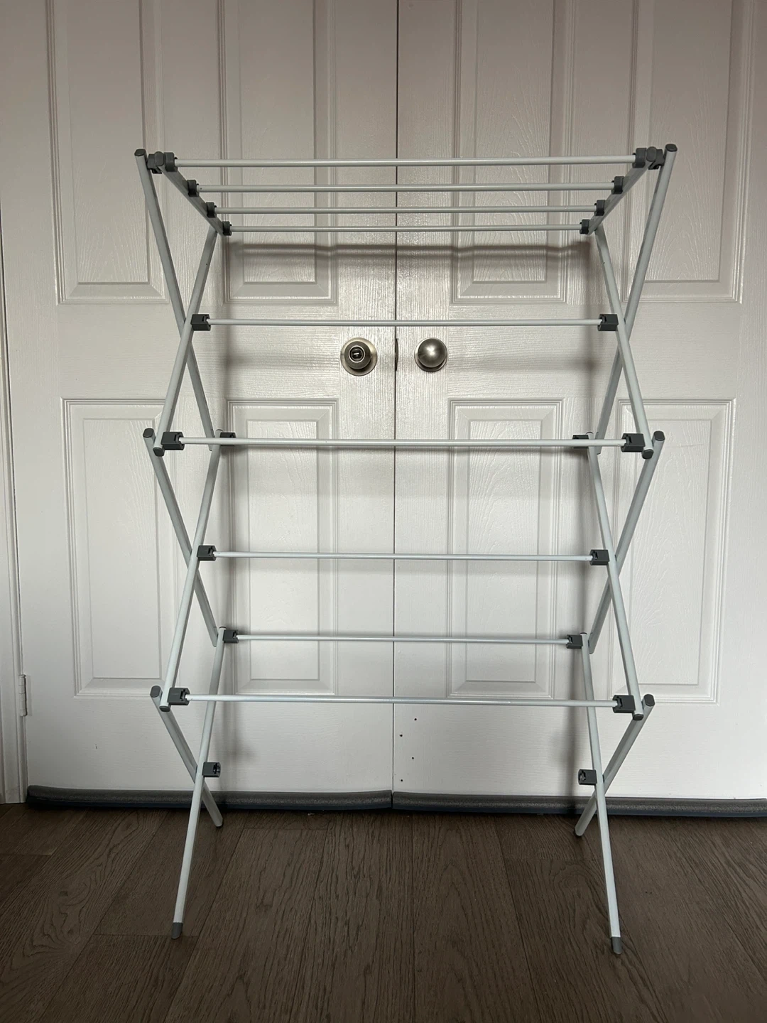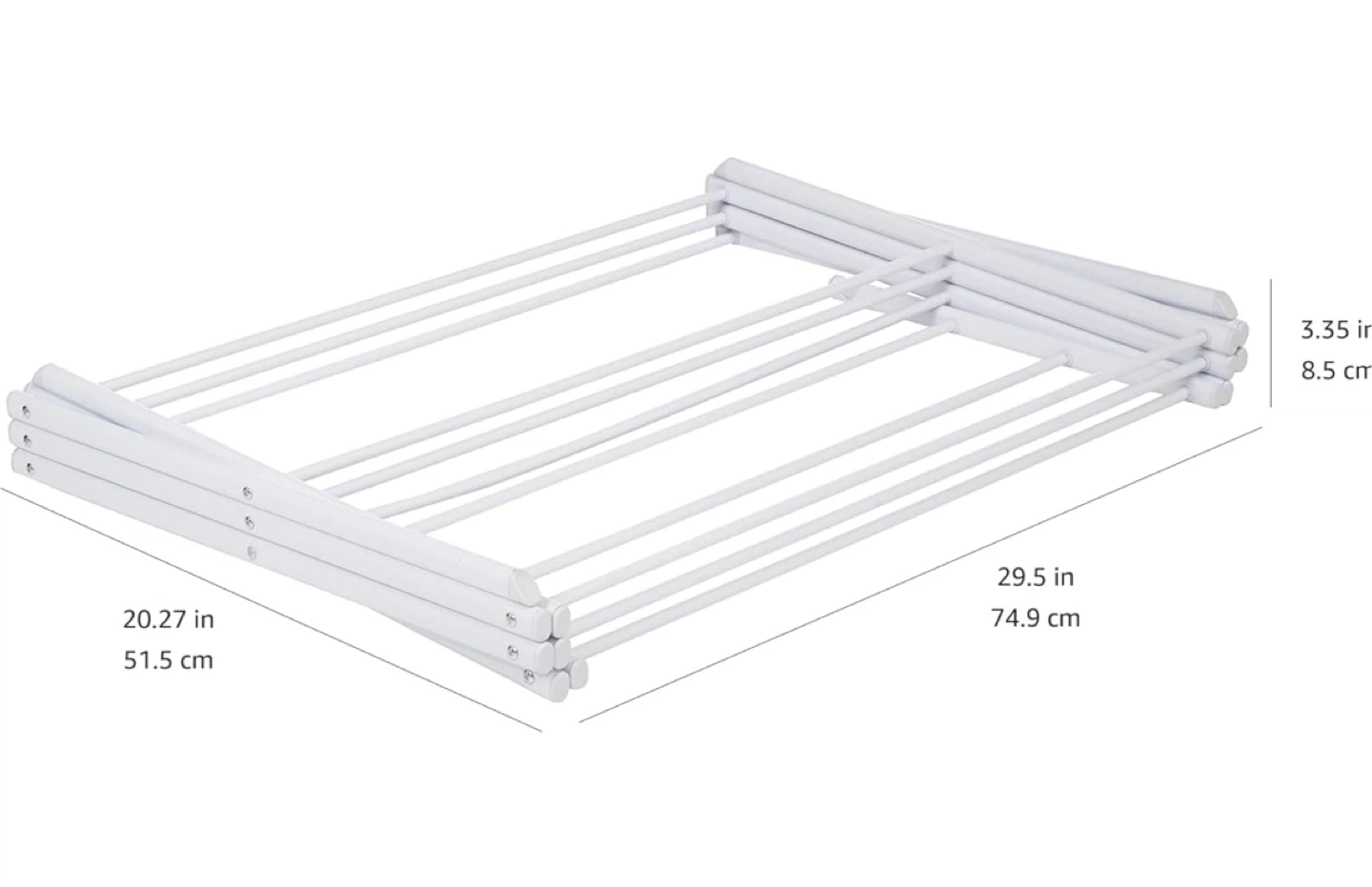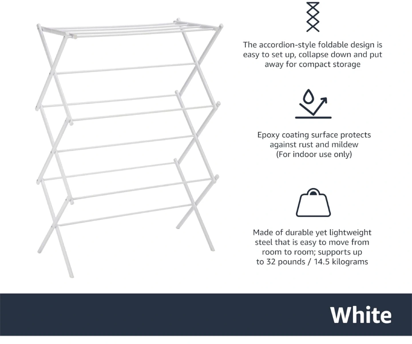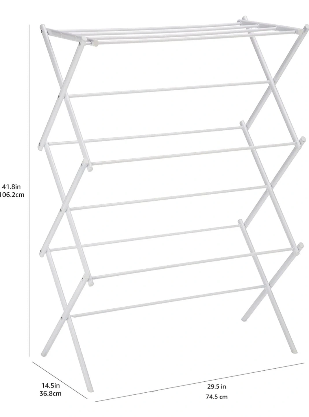 Originally bought for $40+! This white, foldable clothes drying rack is super handy for small spaces! It's easy to set up and collapses down for compact storage. The epoxy coating protects against rust and mildew, so it's perfect for indoor use. Made of durable yet lightweight steel, it's easy to move from room to room and can support up to 32 pounds or 14.5 kilograms. Dimensions are approximately 41.8 inches (106.2 cm) tall, 29.5 inches (74.5 cm) wide, and 14.5 inches (36.8 cm) deep.