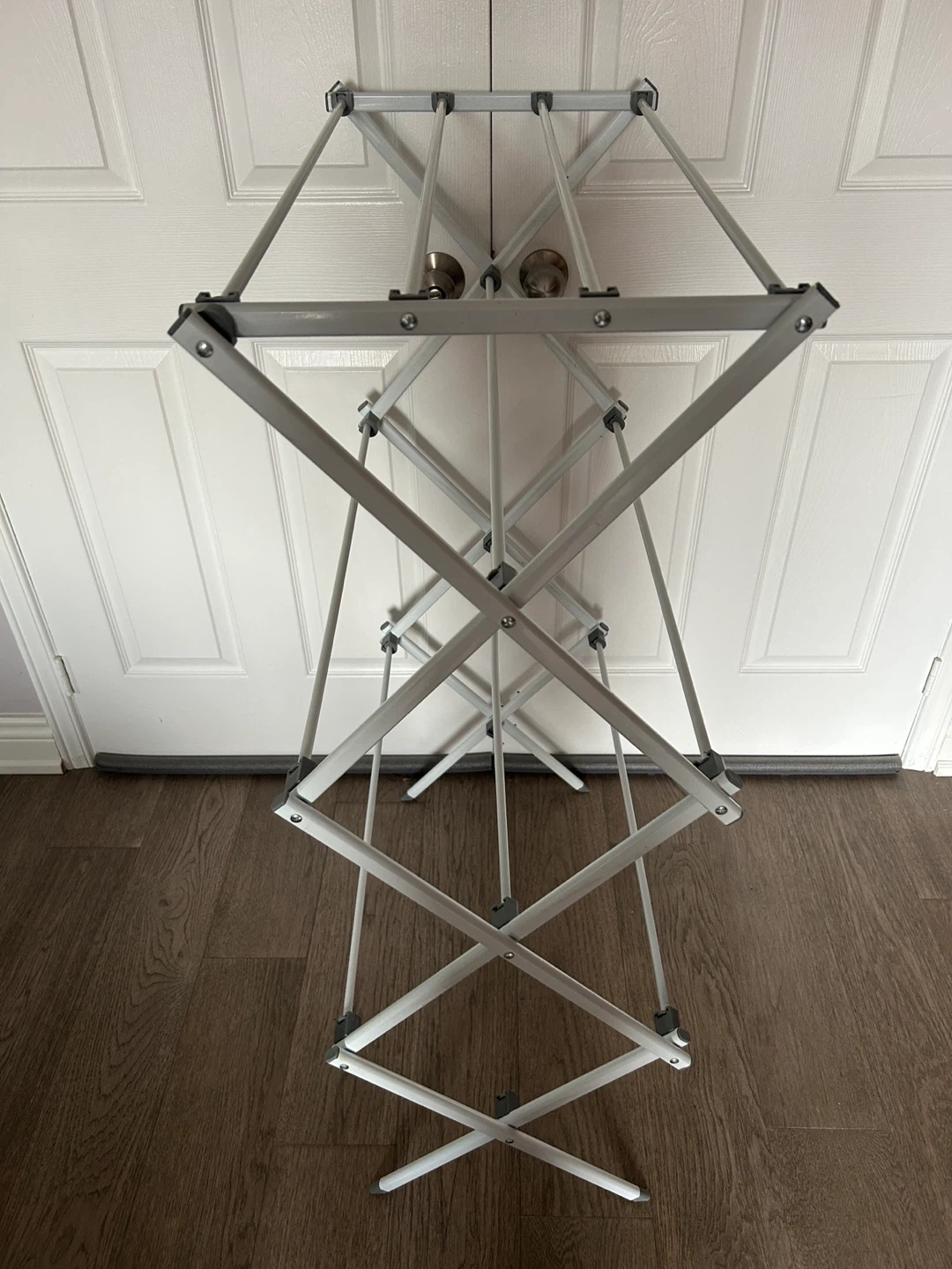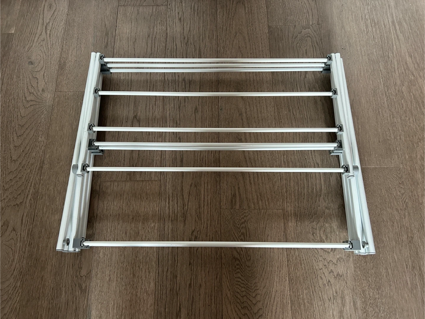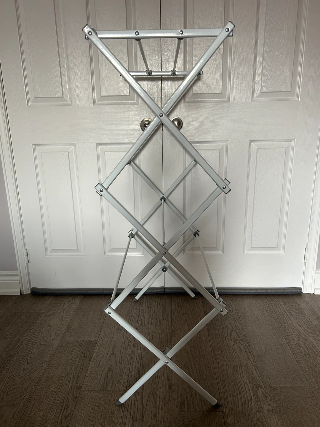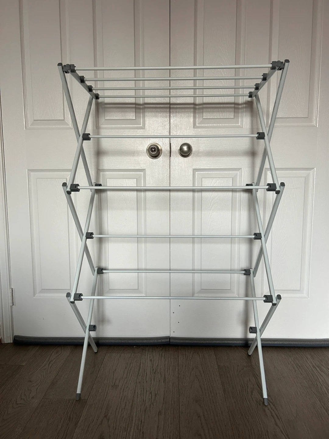 Originally bought for $40+! This white, foldable clothes drying rack is super handy for small spaces! It's easy to set up and collapses down for compact storage. The epoxy coating protects against rust and mildew, so it's perfect for indoor use. Made of durable yet lightweight steel, it's easy to move from room to room and can support up to 32 pounds or 14.5 kilograms. Dimensions are approximately 41.8 inches (106.2 cm) tall, 29.5 inches (74.5 cm) wide, and 14.5 inches (36.8 cm) deep.