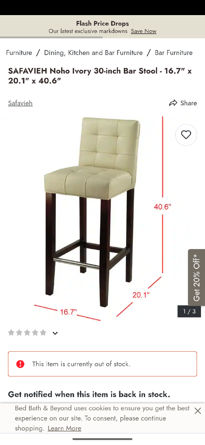 Selling a Safavieh Noho Ivory 30-inch bar stool. It has a seat height of 30 inches and overall dimensions of 16.7 x 20.1 x 40.6 inches.
