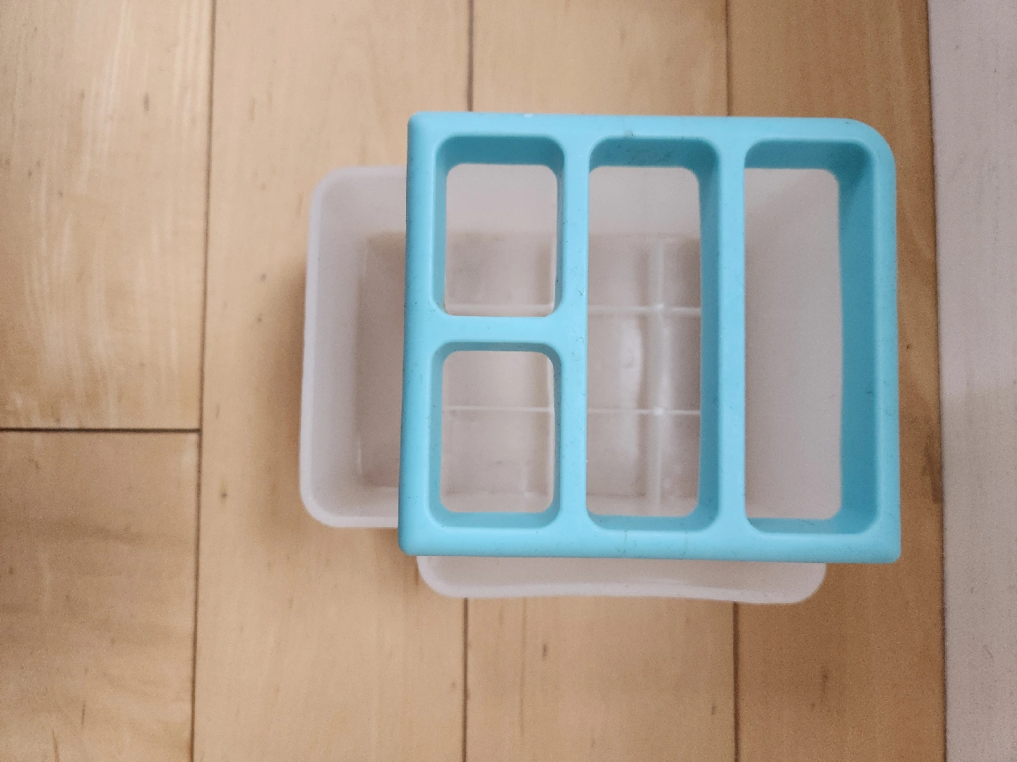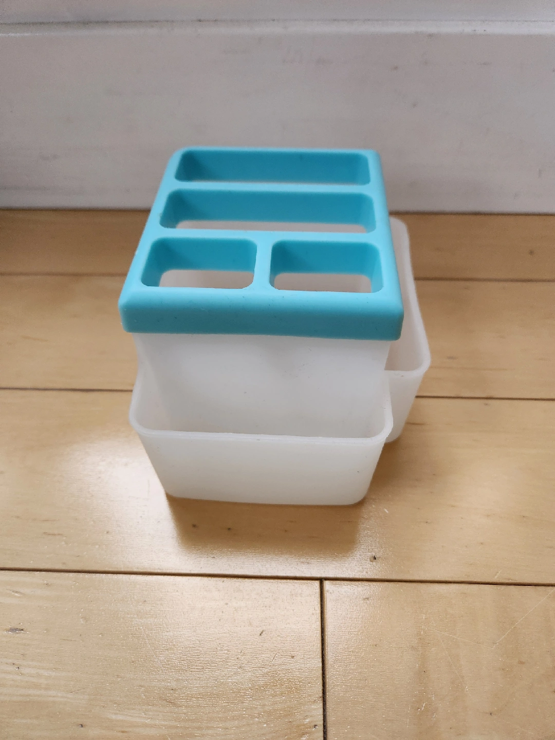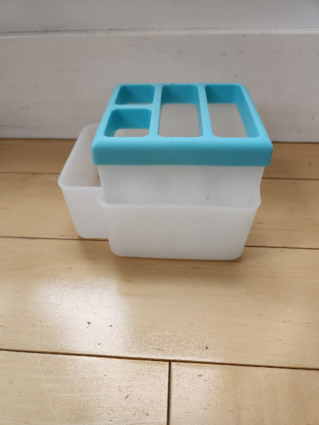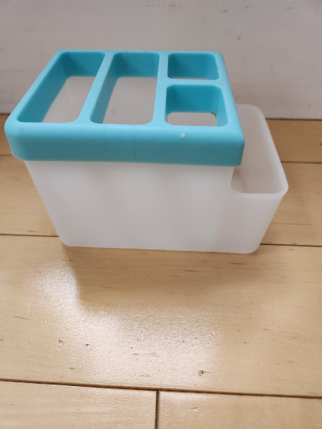This is an organizer with a turquoise top and a white base in great condition. Features multiple compartments of different sizes for organizing various items. Great for storing stationary or used as a makeup or cosmetic organizer. Comes from a smoke and pet free home.
