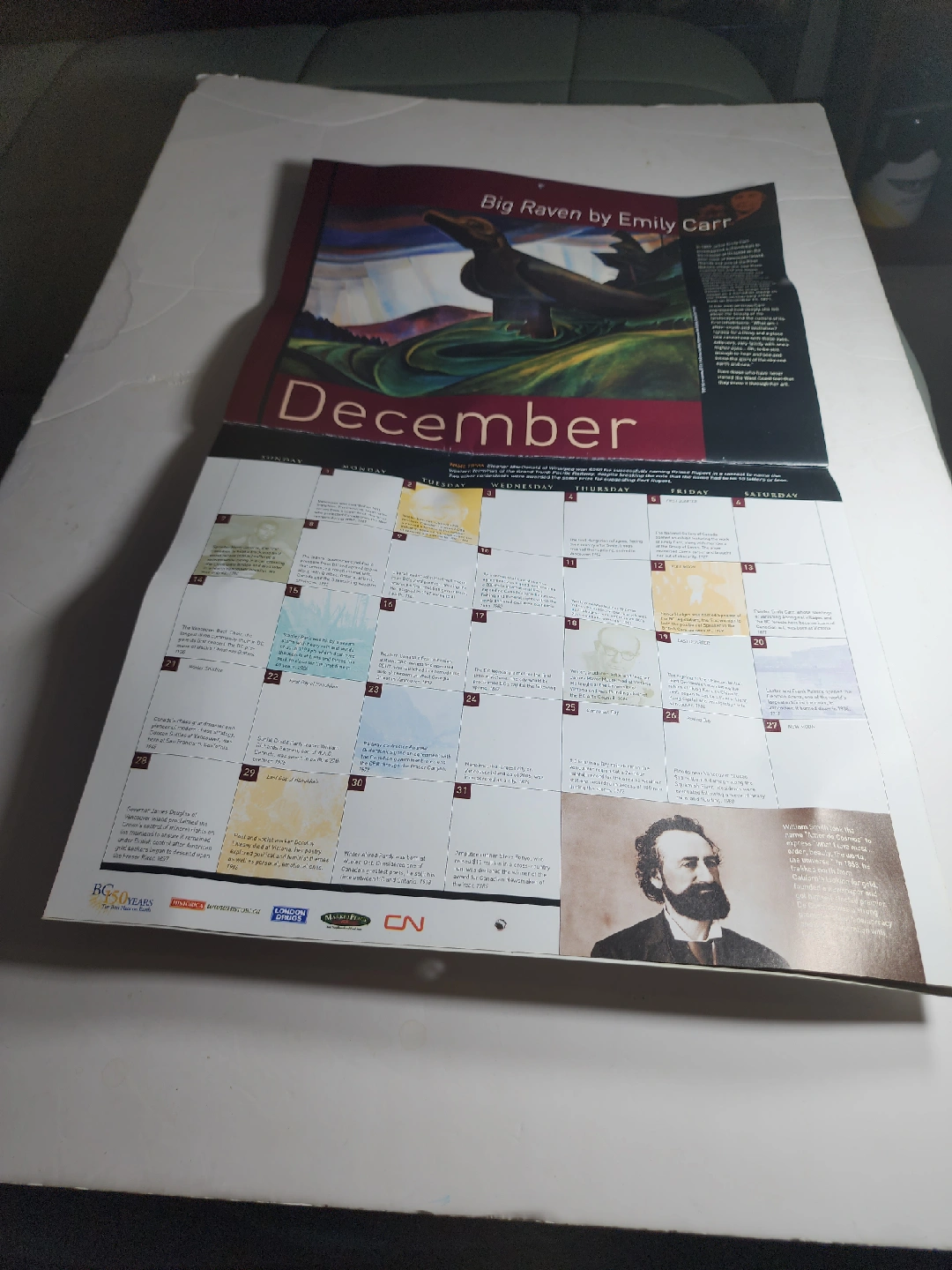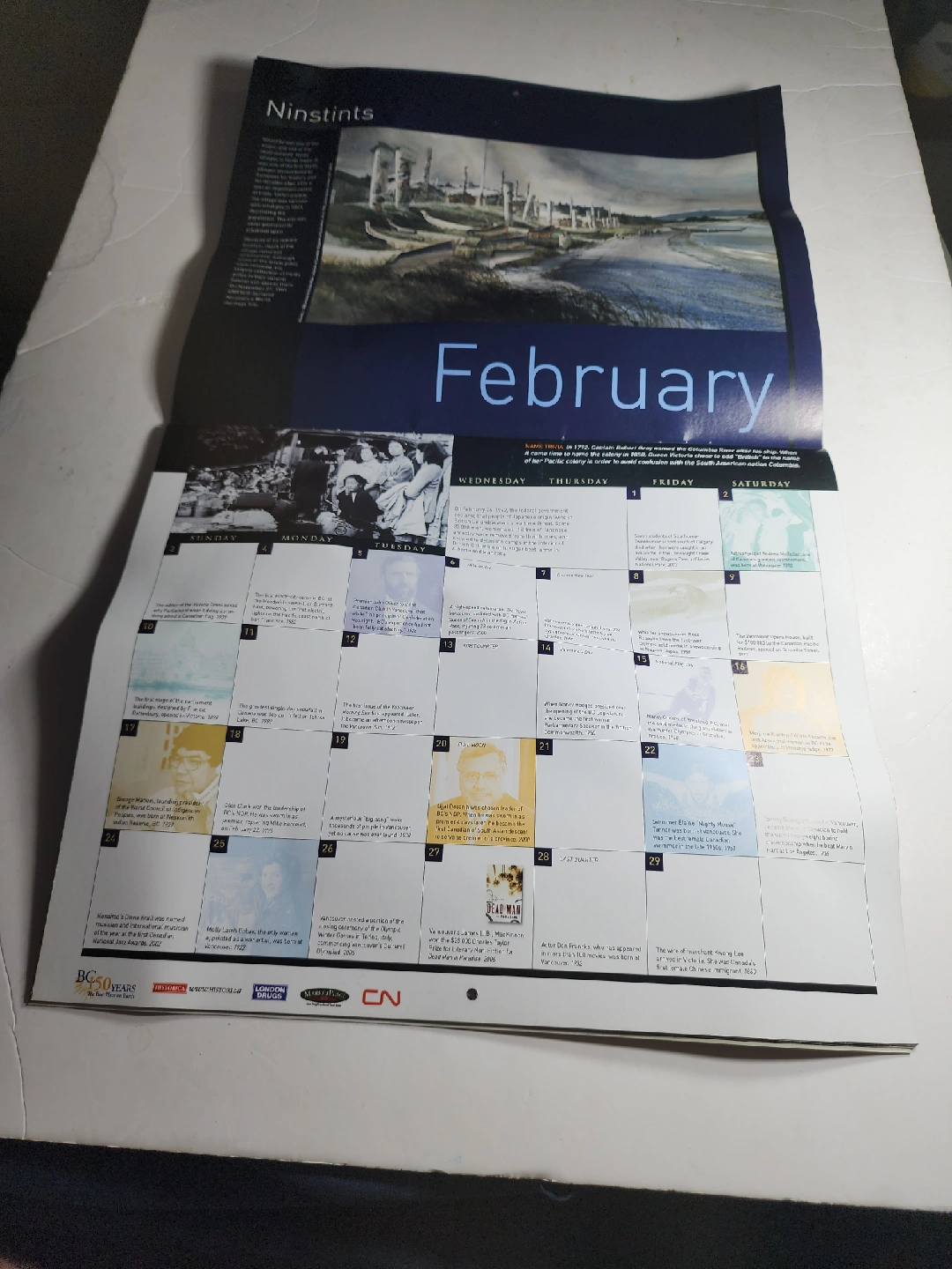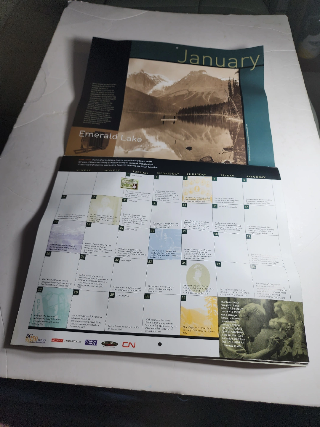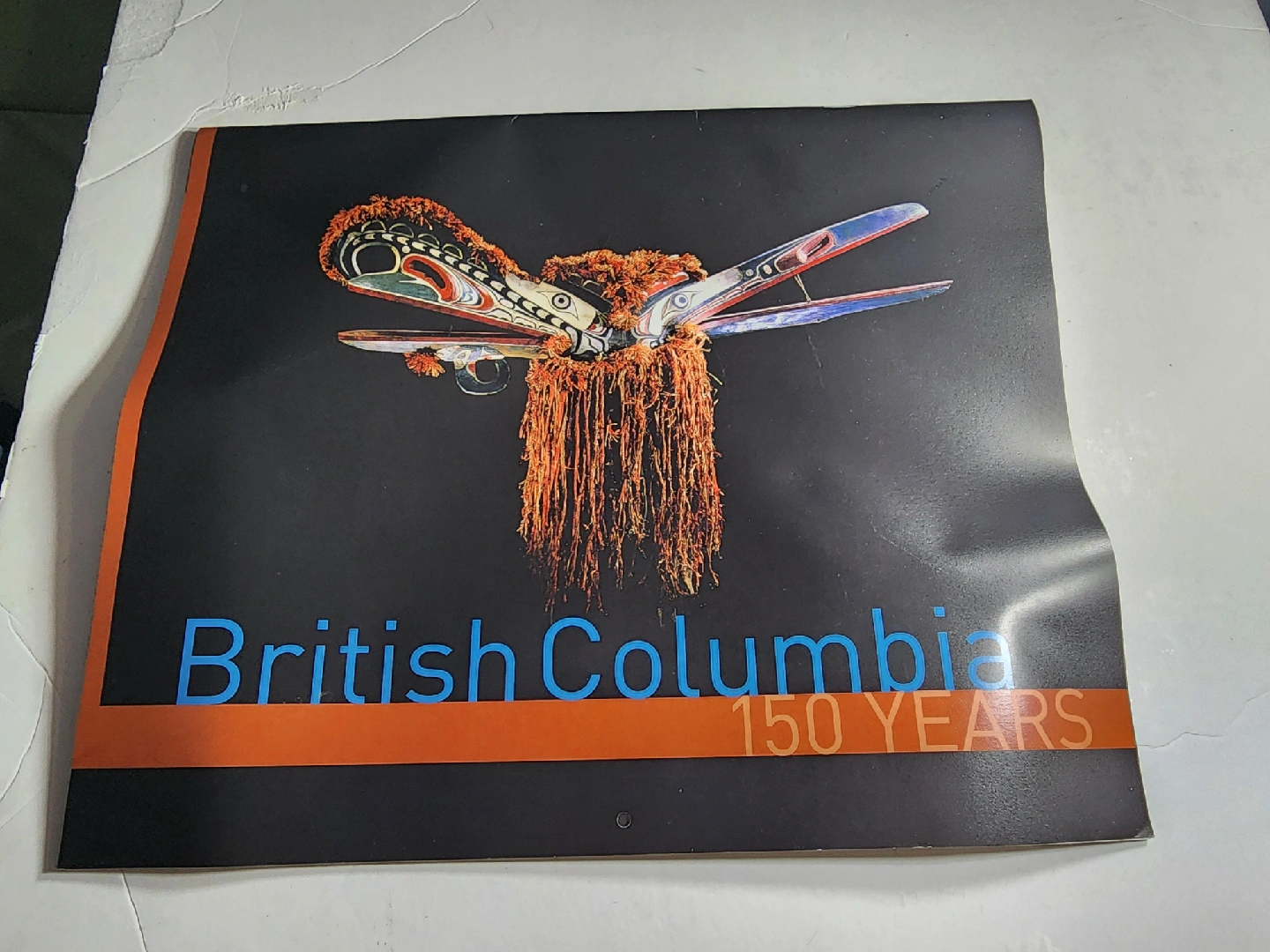 Selling a British Columbia 150 Years calendar. It features historical images and dates related to the province's history. Great for anyone interested in BC history or as a decorative piece