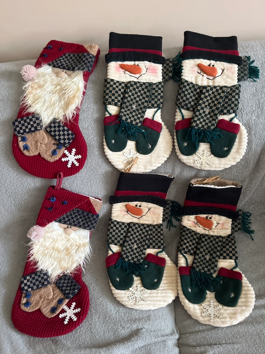 63Selling a set of five Christmas stockings. Three are snowman themed and two are Santa themed. Great for the holidays! $4 each Cash Only please