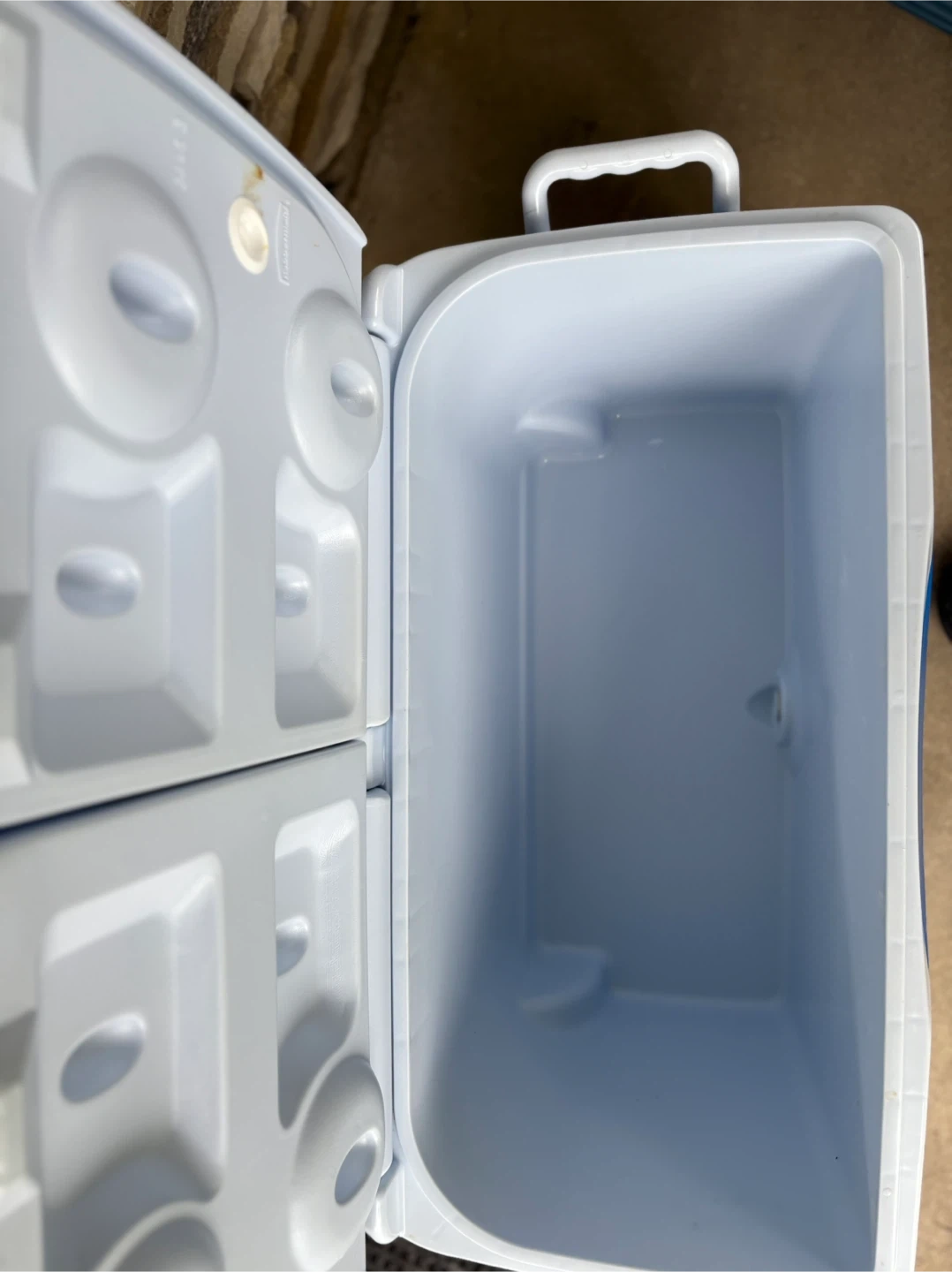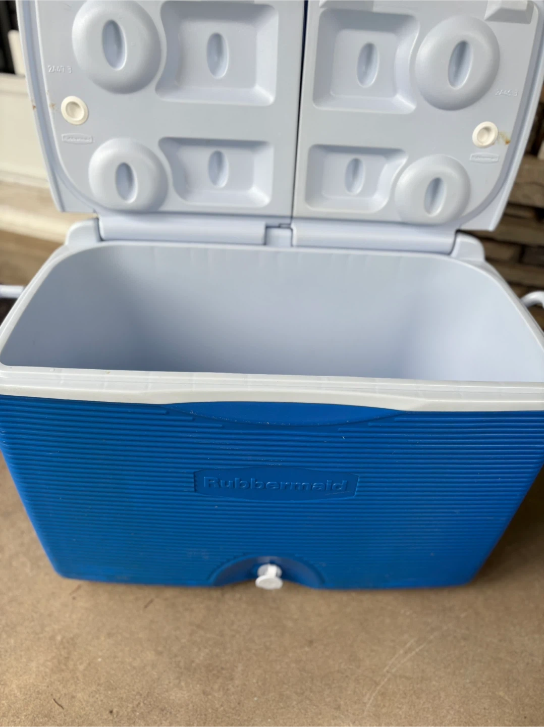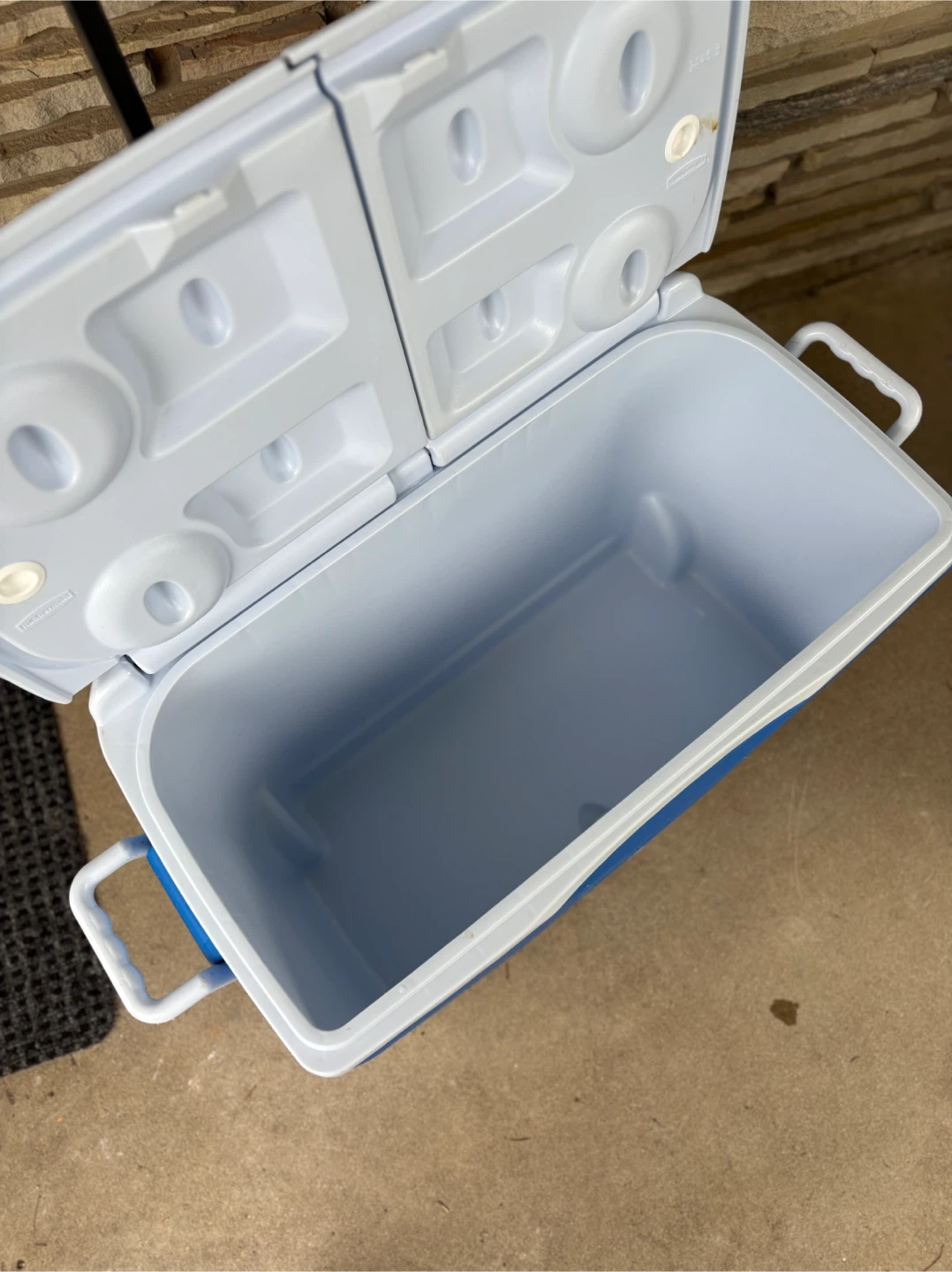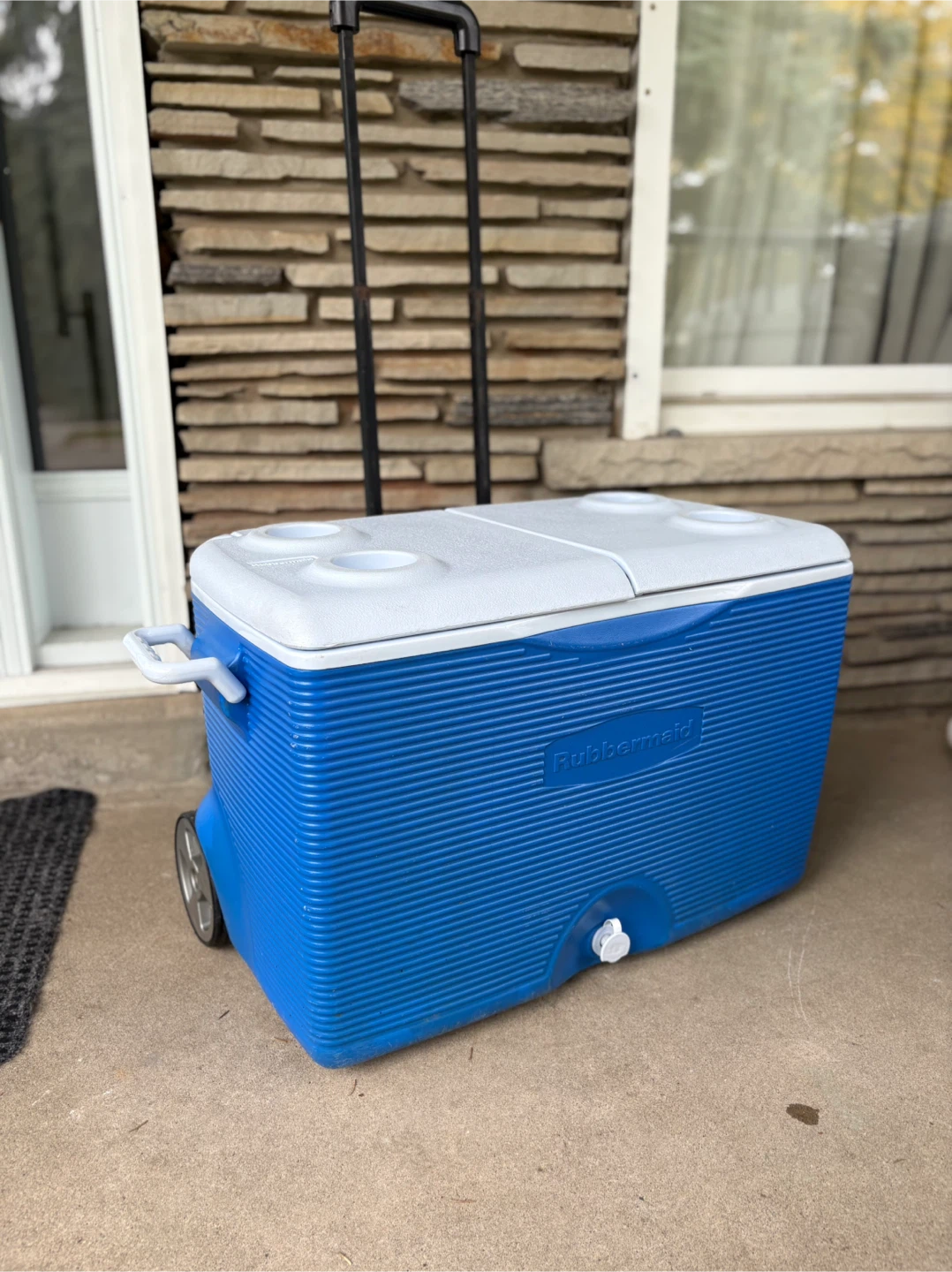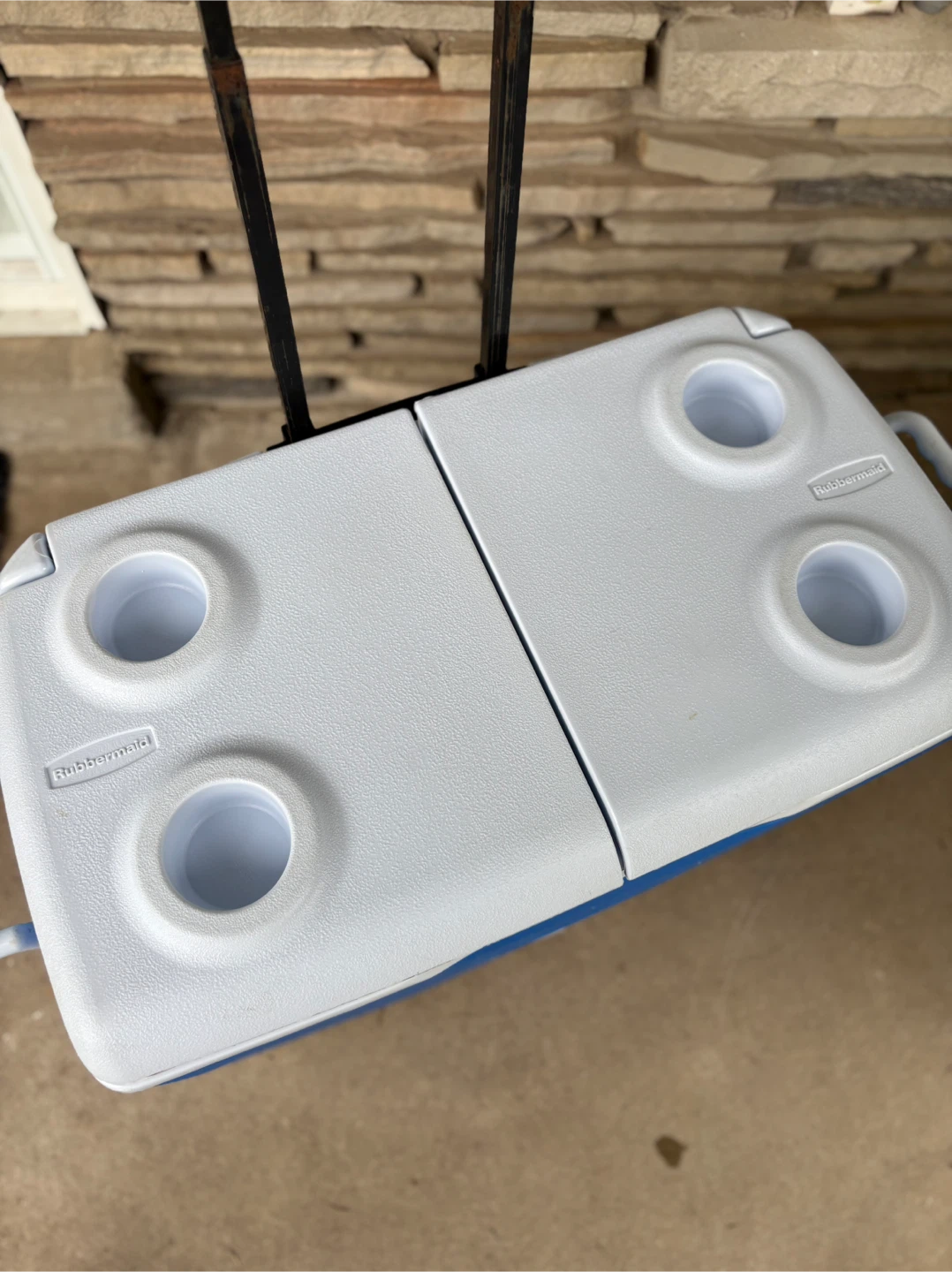 Selling a blue Rubbermaid wheeled cooler! It has a telescoping handle for easy transport and cup holders on top. Great for picnics, camping, or any outdoor event