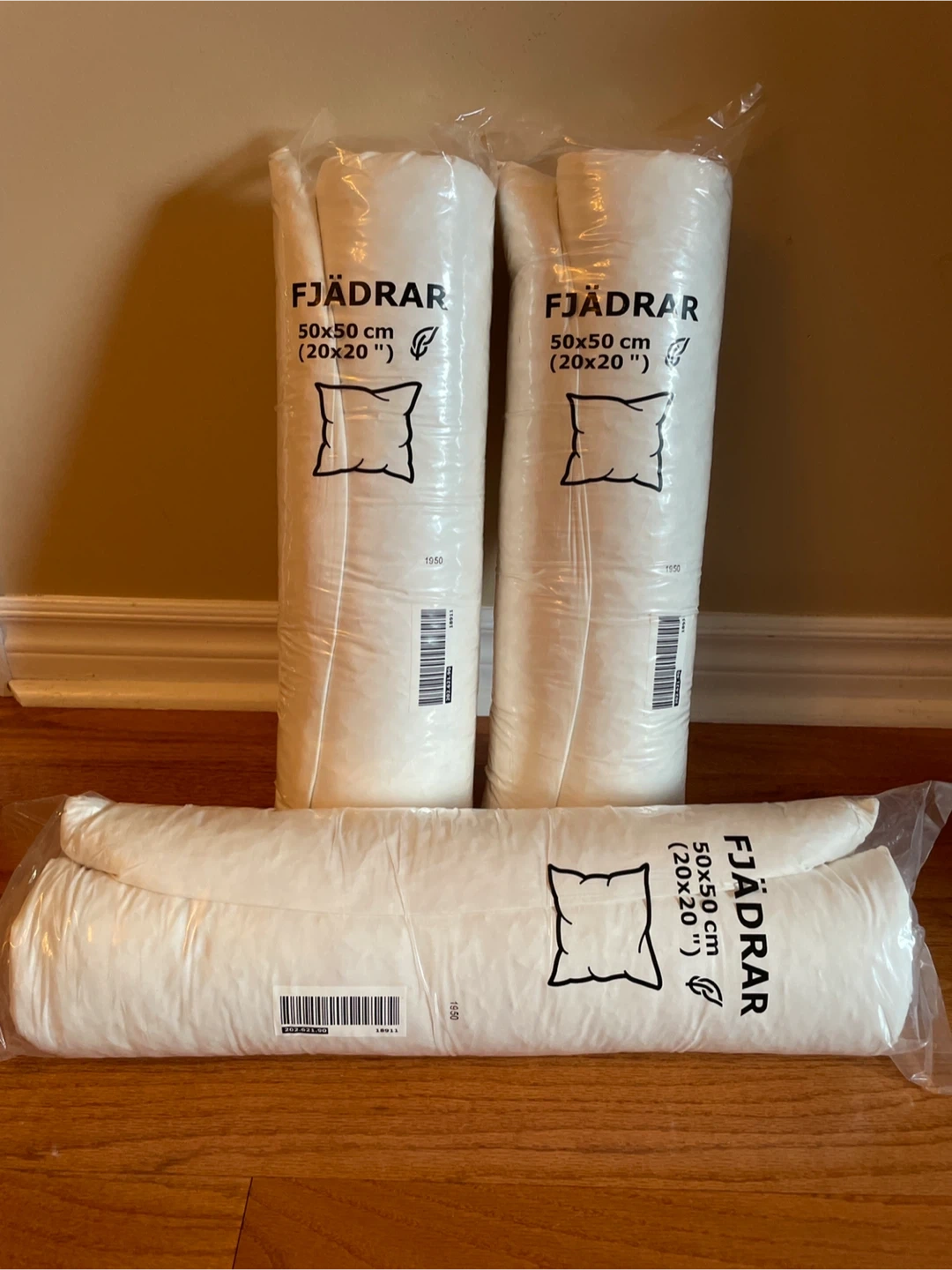 Selling (3) IKEA FJÄDRAR Inner Cushions. Brand New, still sealed. They're 50x50 cm (20x20 inches) in size and ready to fluff up your space $20 for all three.