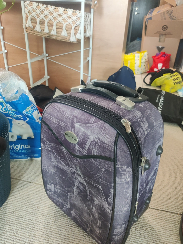 Selling a Pierre Cardin carry-on suitcase. It has a denim-like pattern and is in good condition. Perfect for short trips!