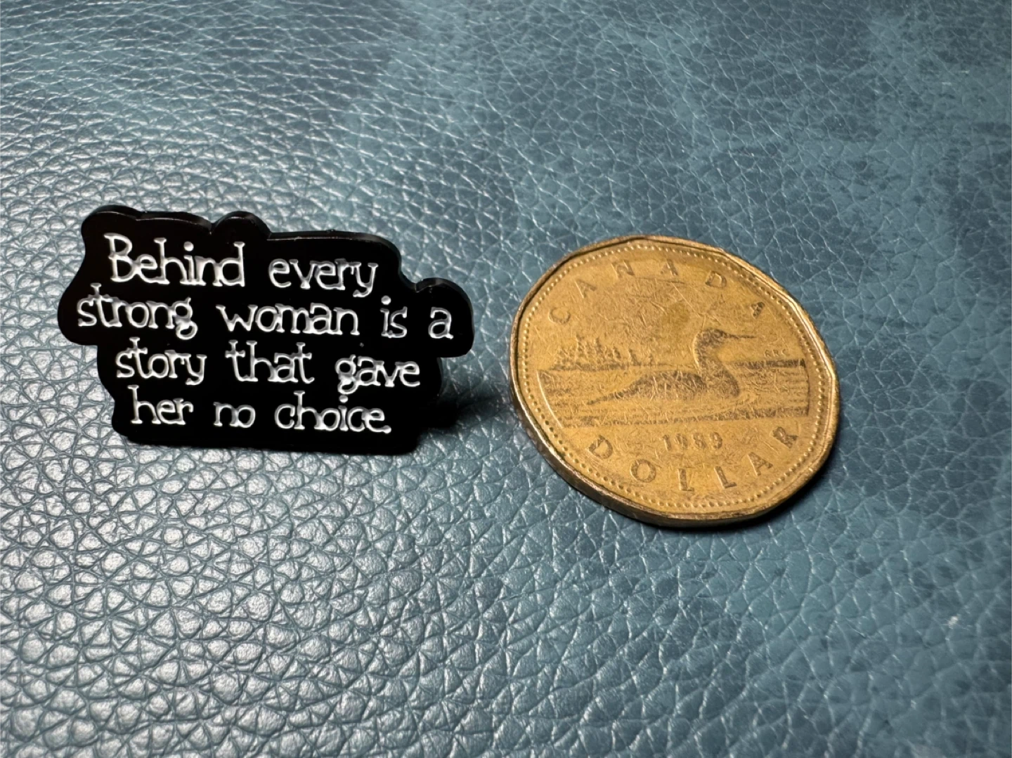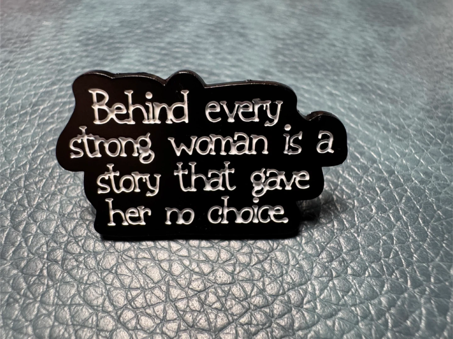 Selling a black enamel pin that reads: Behind every strong woman is a story that gave her no choice.