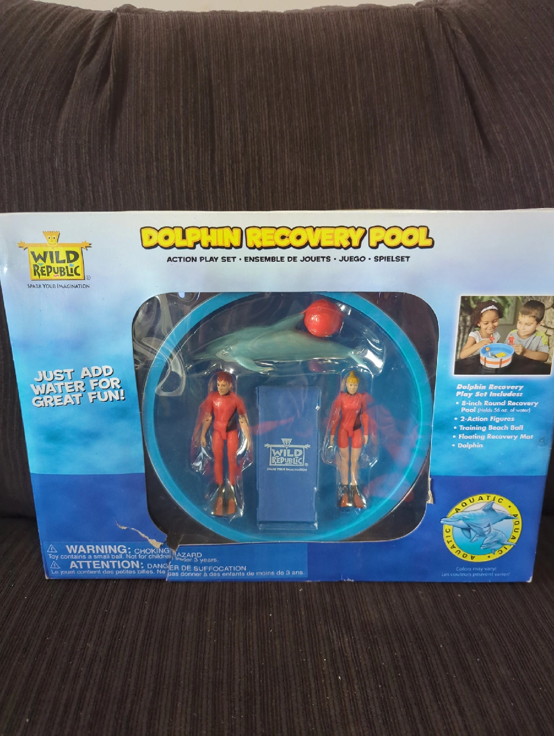 76Get ready for some aquatic fun with this Wild Republic Dolphin Recovery Pool play set! It includes an 8-inch round recovery pool, two action figures, a training beach ball, a floating recovery mat, and a dolphin. Just add water for great fun!