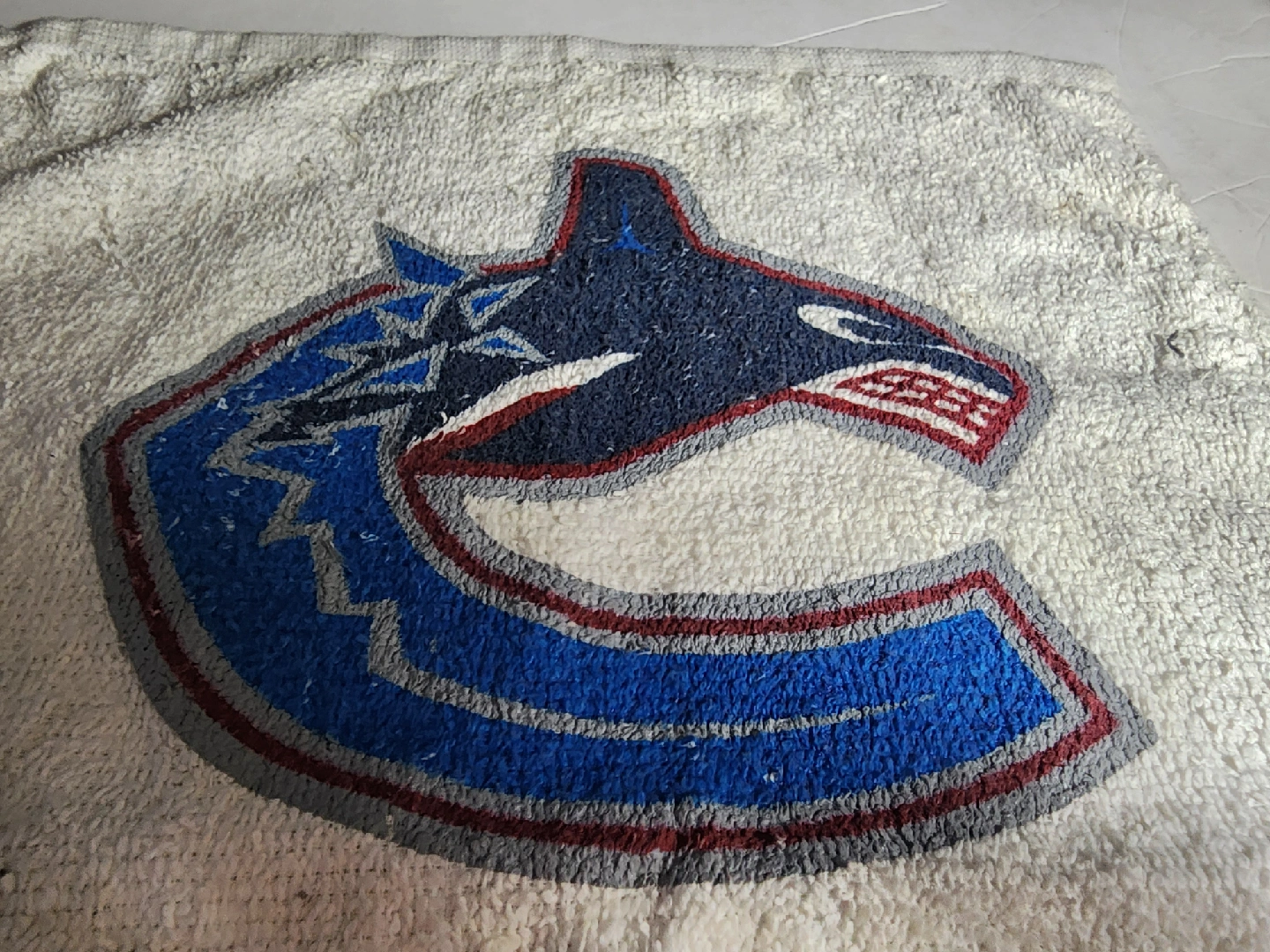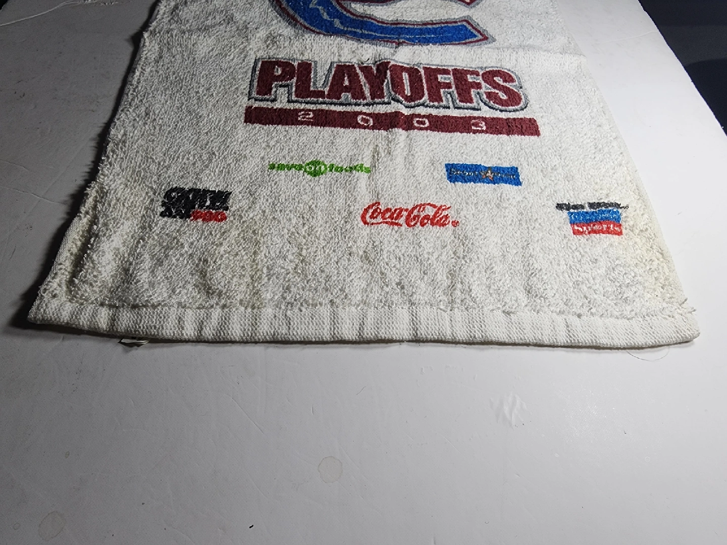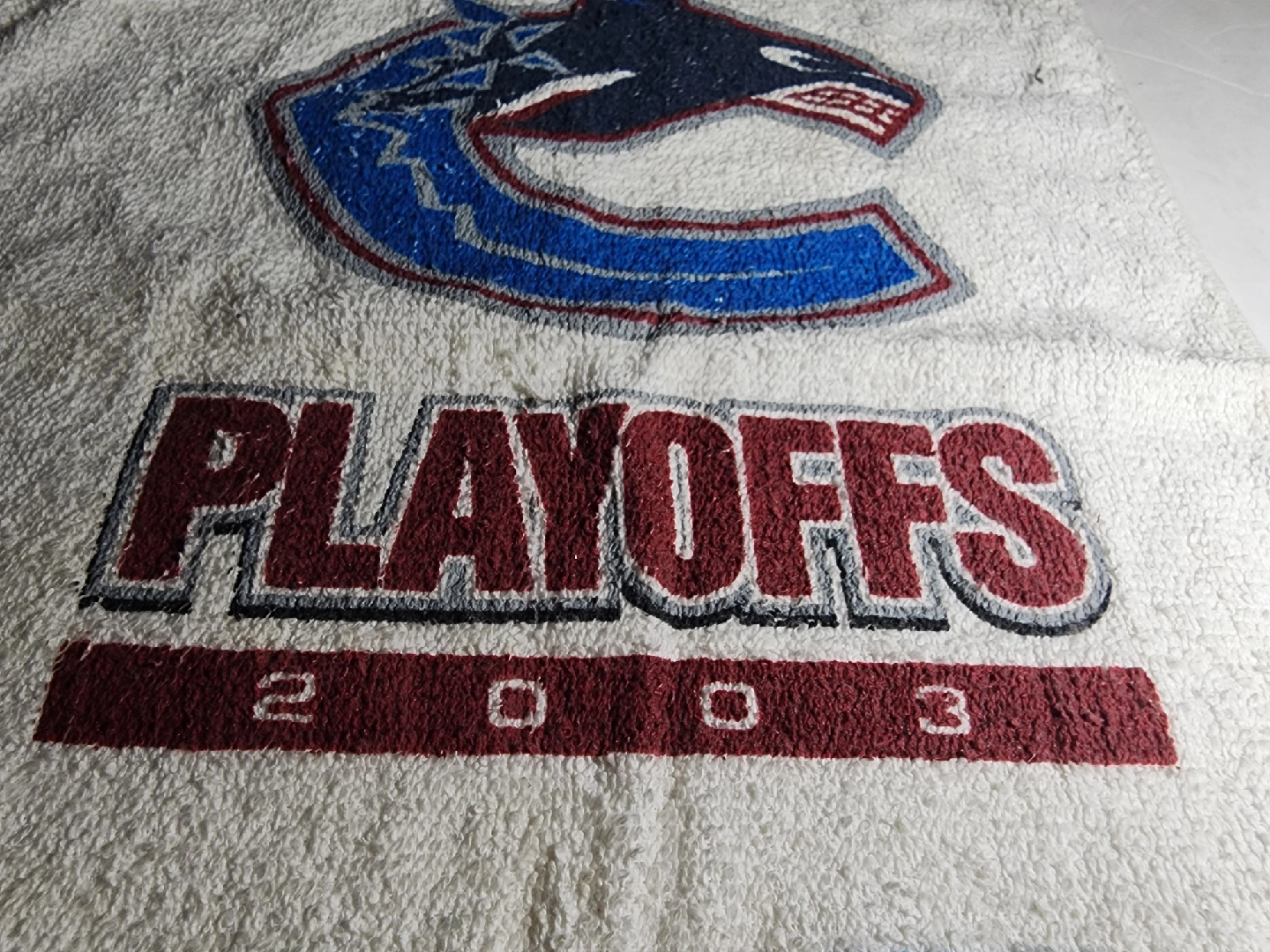 Selling a Vancouver Canucks towel from the 2003 playoffs! It features the Canucks logo and the word "PLAYOFFS" with the year 2003. There are also logos for sponsors like Coca-Cola and Save-On-Foods. Great for any Canucks fan!
