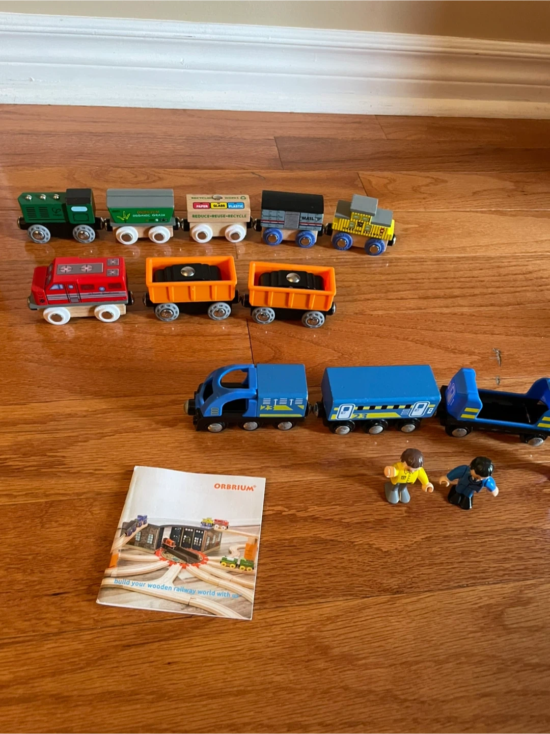 76Selling an Orbrium wooden railway train set! It comes with a variety of train cars and some figurines for imaginative play. Great for kids who love trains and building their own railway adventures