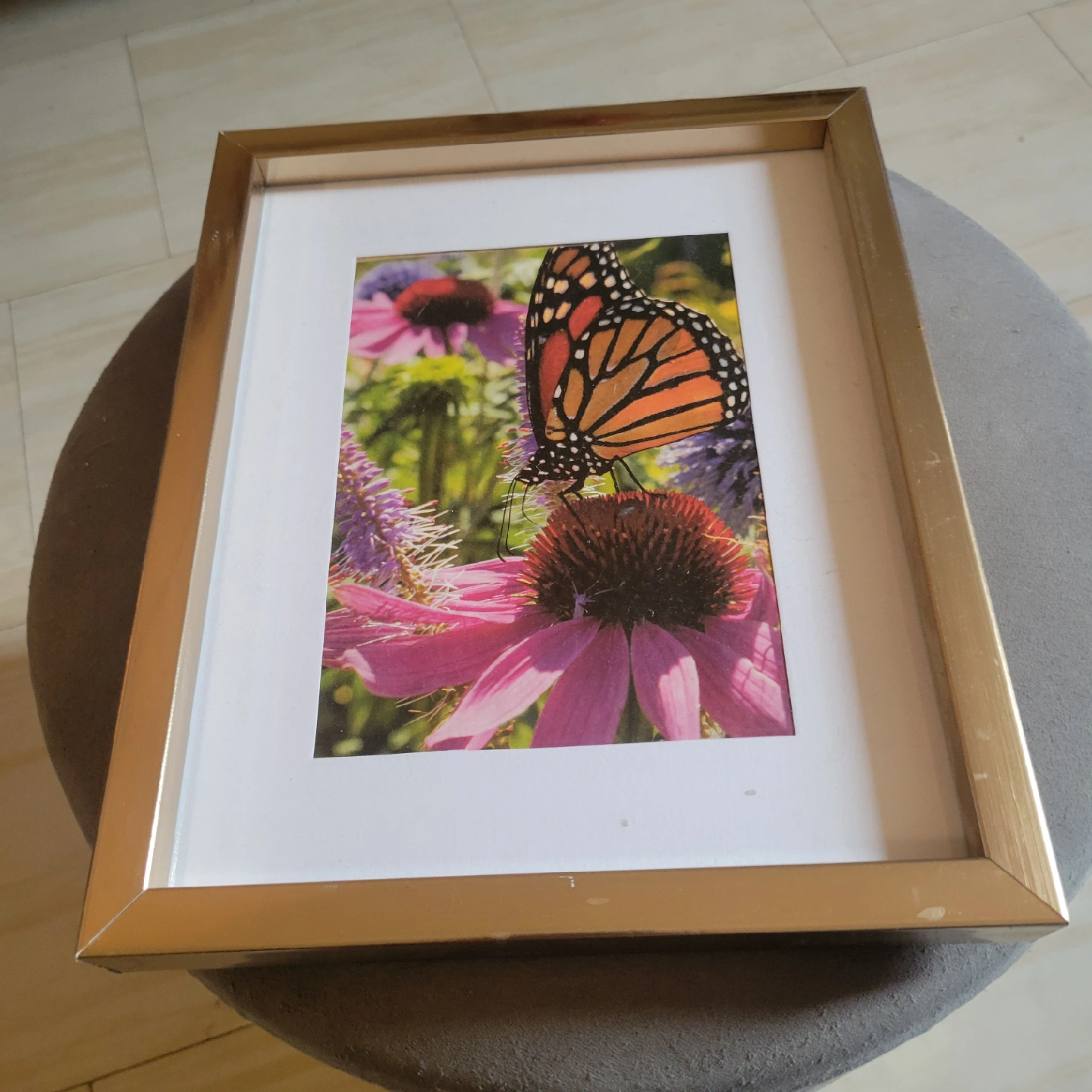 77A lovely framed picture of a butterfly on a flower. The frame is a nice gold colour. Perfect for adding a touch of nature to your home decor!