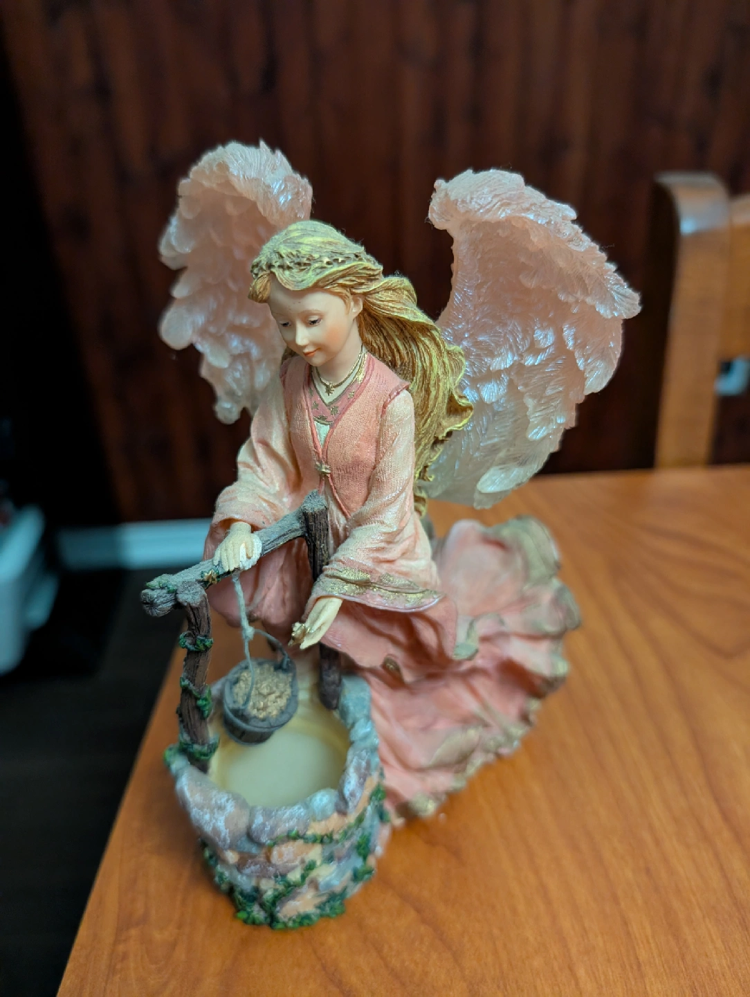 A beautiful angel figurine with a wishing well. Perfect for adding a touch of serenity to any room. The angel is wearing a pink dress and has golden hair.