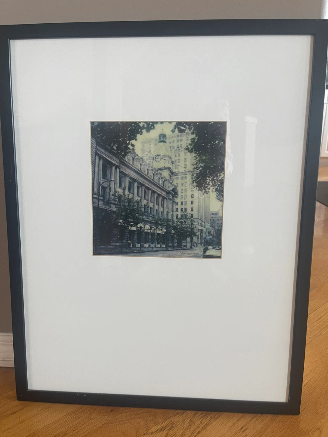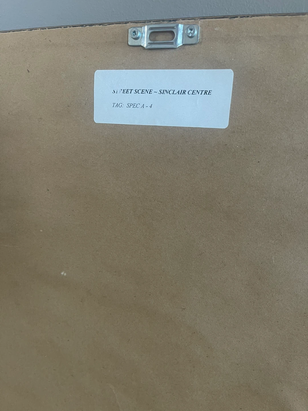 Framed print of a street scene featuring the Sinclair Centre. The tag on the back reads: STREET SCENE - SINCLAIR CENTRE. Perfect for adding a touch of architectural charm to your home!