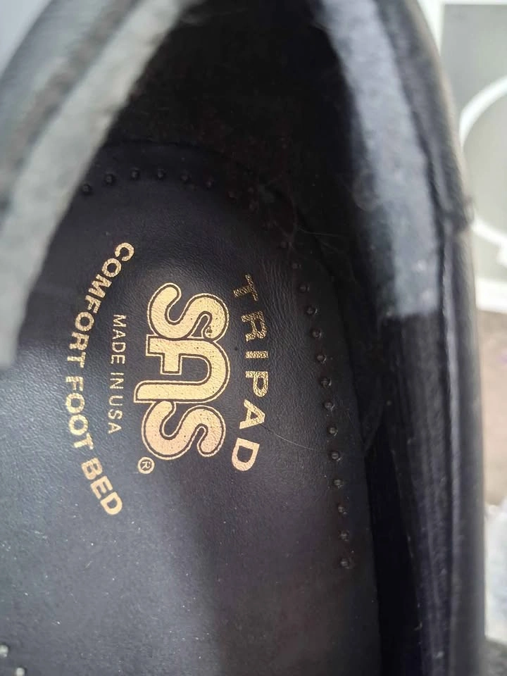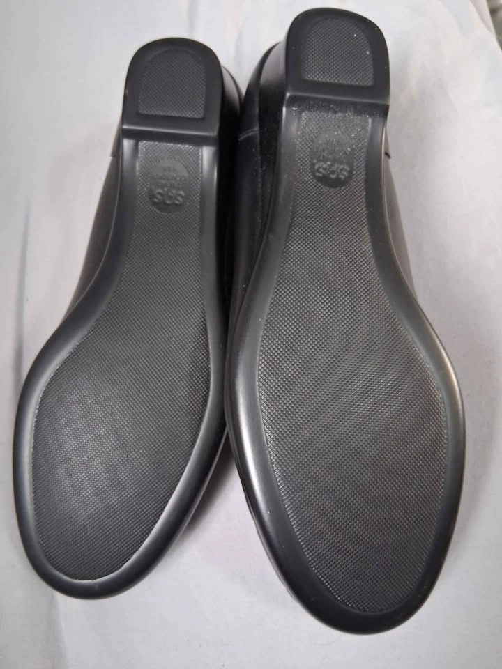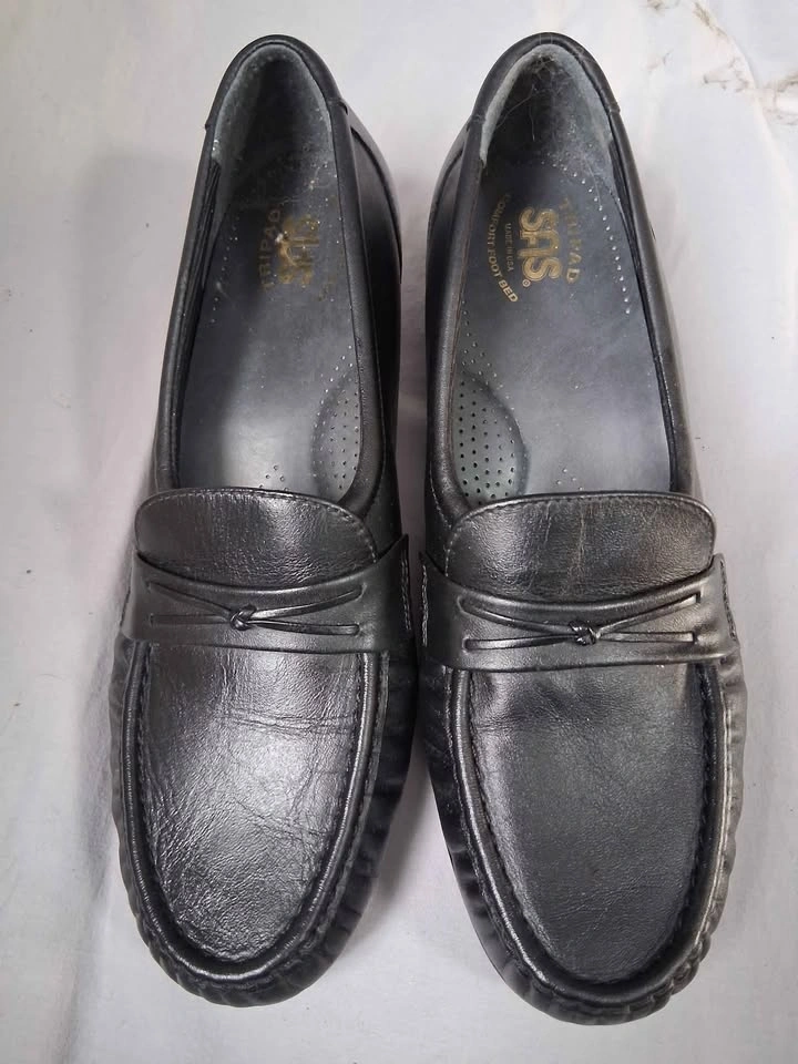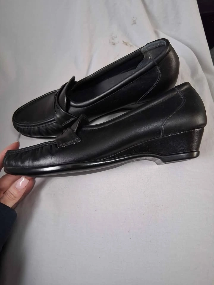 Women's size 9.5 black leather loafer with low heel and comfort foot bed. Brand is SAS, made in USA. Pick up in south Ajax.