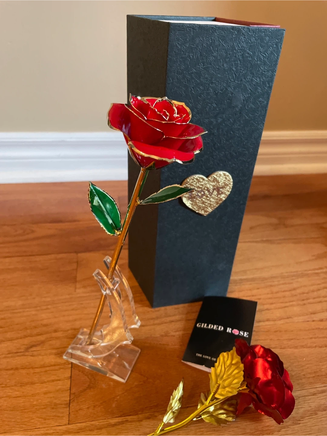 Selling a beautiful Gilded Rose that comes with its stand and original box! This elegant piece is perfect for adding a touch of sophistication to any room. The rose features a stunning red bloom with gold accents, making it a timeless keepsake. It's in excellent condition and ready to find a new home. Perfect condition. Ready to be a romance gift. Throwing in an additional metal gilded rose, individual without stand or case, for free.