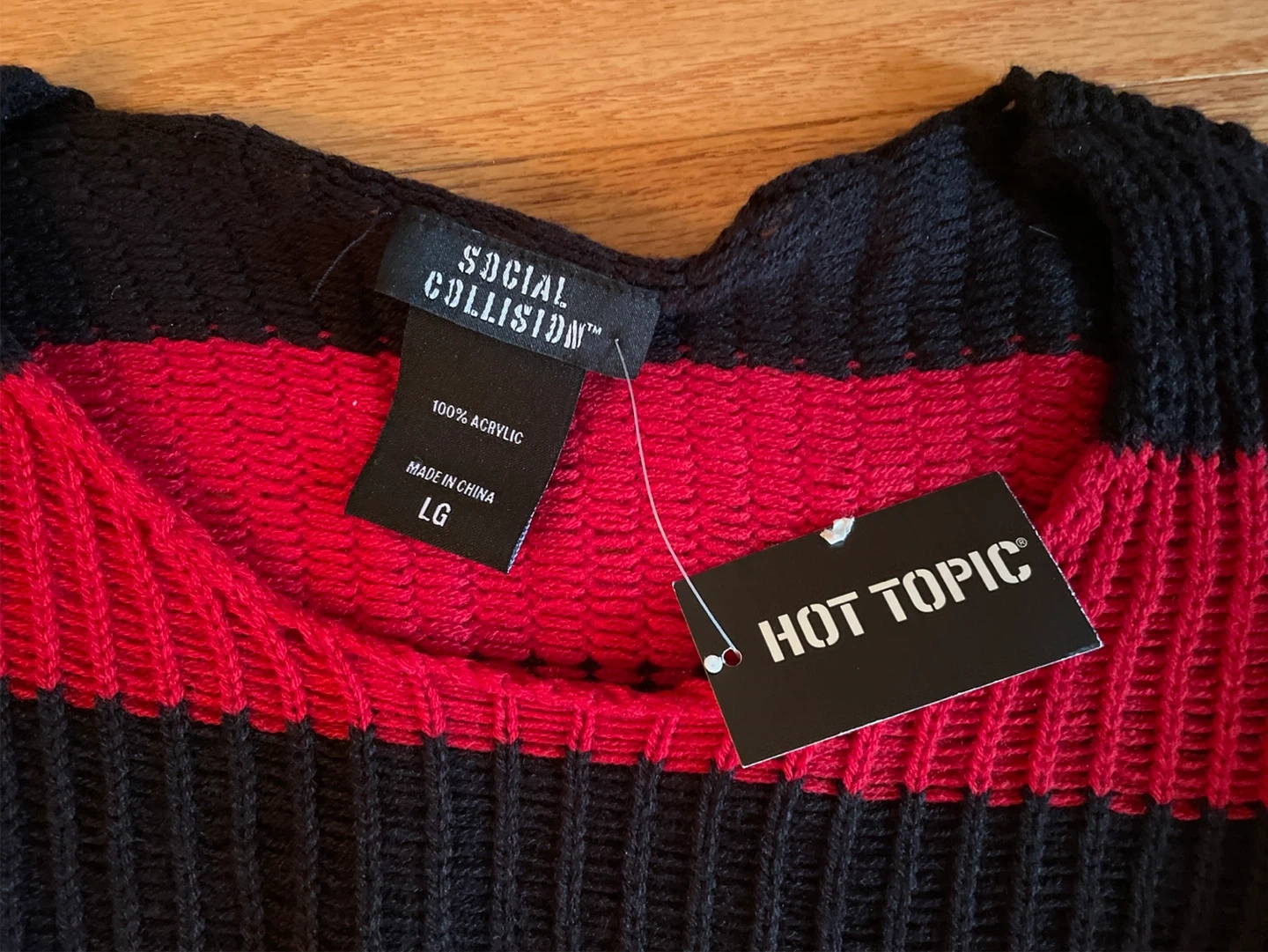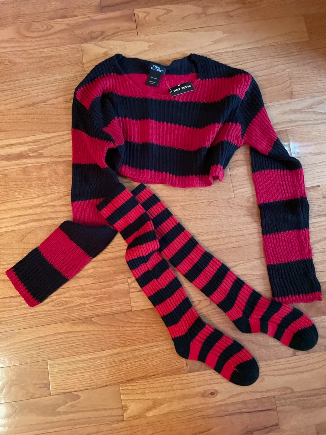 76Here's a cute Social Collision sweater and socks set! The sweater is a cropped style, and both pieces feature a red and black striped pattern. The sweater is a size large and made of 100% acrylic. Perfect for adding a pop of colour to your wardrobe! Never worn. Tags on.