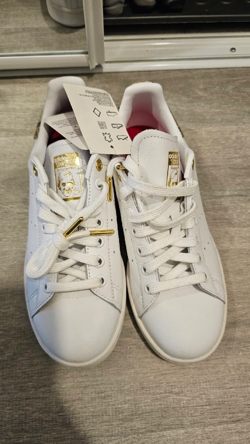 40These Adidas Stan Smith shoes are brand new and ready for a new home! They're white with gold accents and a unique snakeskin detail on the heel. Super stylish and comfortable! Size 6.5 US