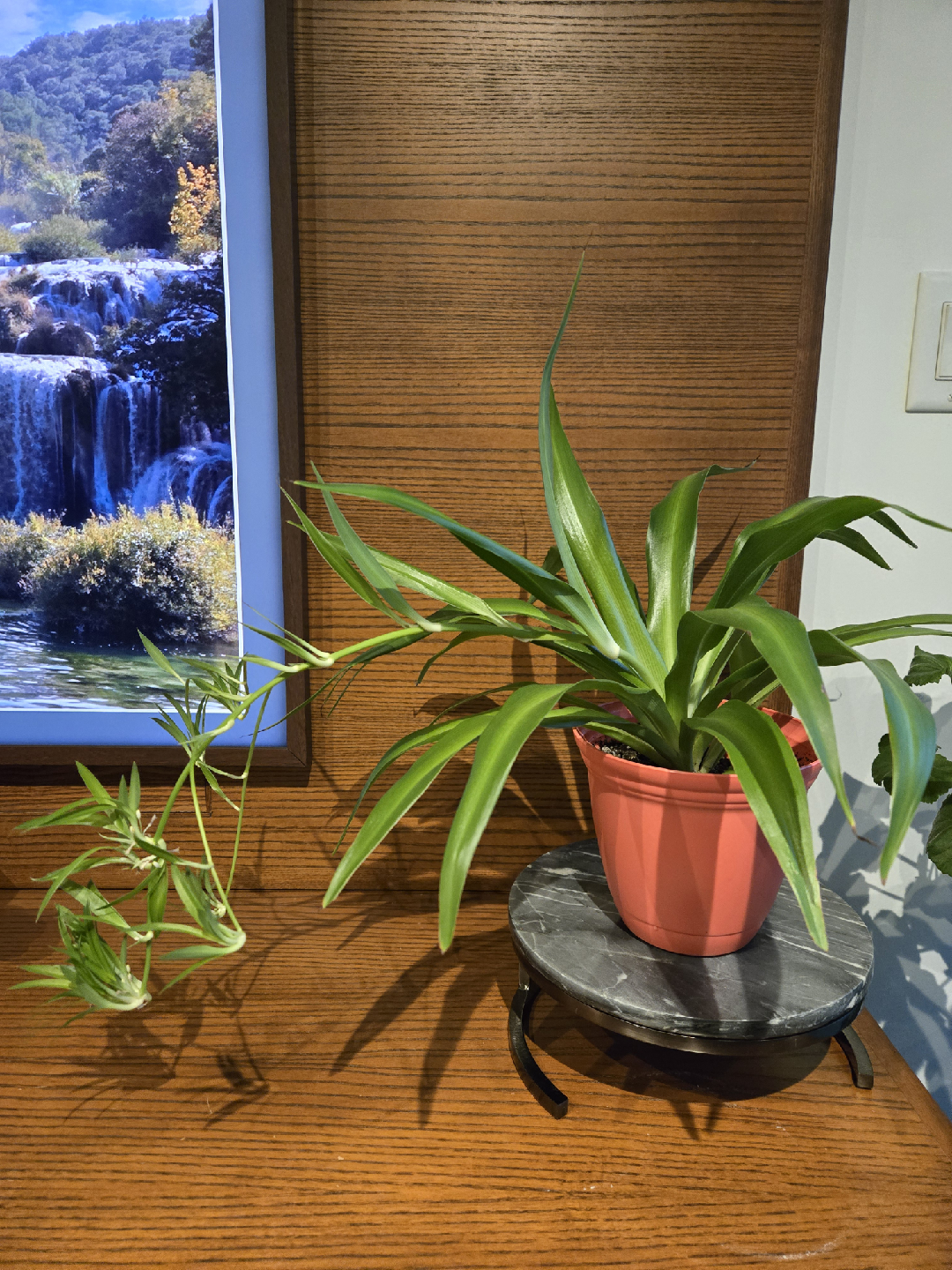 Selling a healthy spider plant, perfect for adding some greenery to your home! This plant is easy to care for and thrives in various lighting conditions. Comes with the pot, and loads of baby plants!