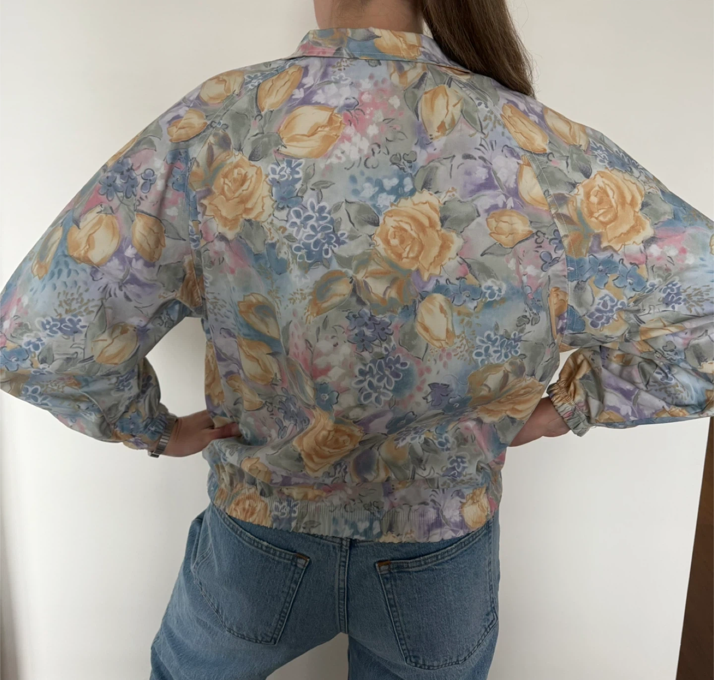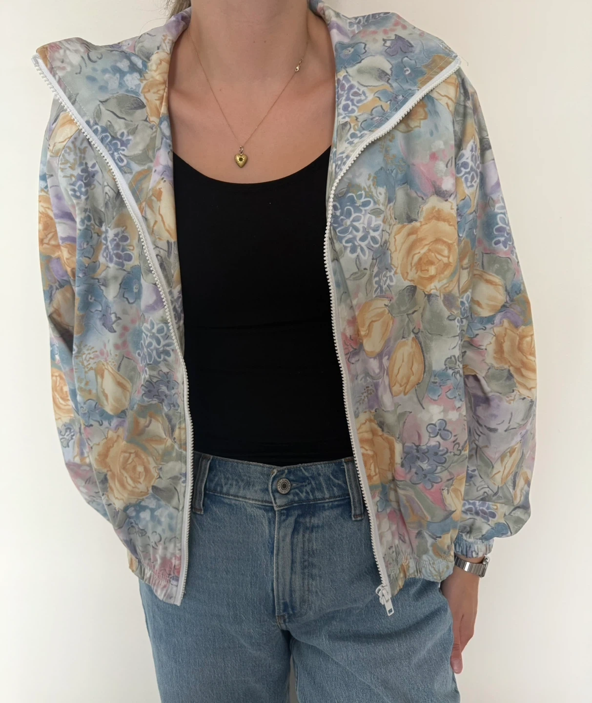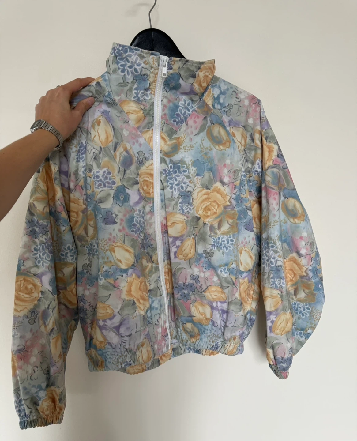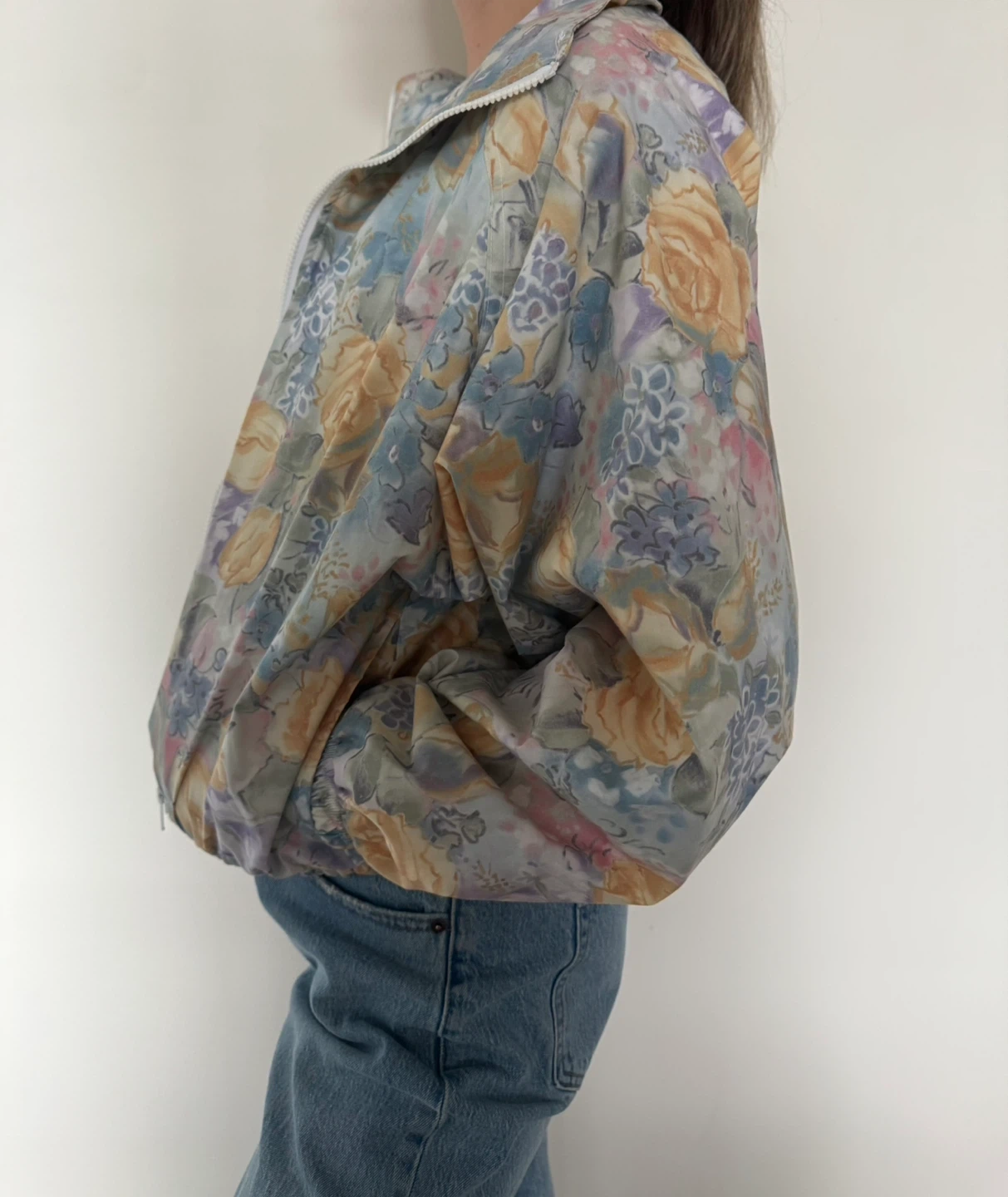 384Here's a lovely floral print jacket from Head! It's a size M and features a beautiful pattern of roses and other flowers in pastel shades. Perfect for adding a touch of whimsy to your fall wardrobe! (or thinking ahead to spring…🌷) Fits like a nice boxy medium. MODEL IS TALL — 5”11 — so it shouldn’t be too cropped on other heights!