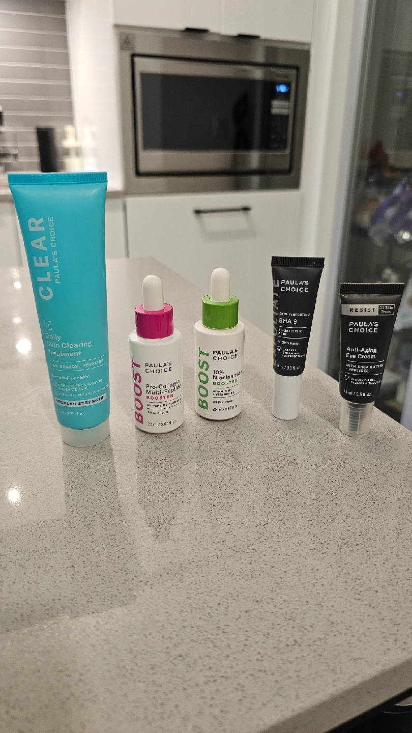 Selling a set of Paula's Choice skincare products! Includes: - CLEAR Daily Skin Clearing Treatment (2.5 fl oz) - BOOST Pro-Collagen Multi-Peptide Booster (20 ml / 0.67 fl oz) - BOOST 10% Niacinamide Booster (20 ml / 0.67 fl oz) - SKIN PERFECTING BHA 9 - RESIST Anti-Aging Eye Cream (15 ml / 0.5 fl oz) All slightly used.