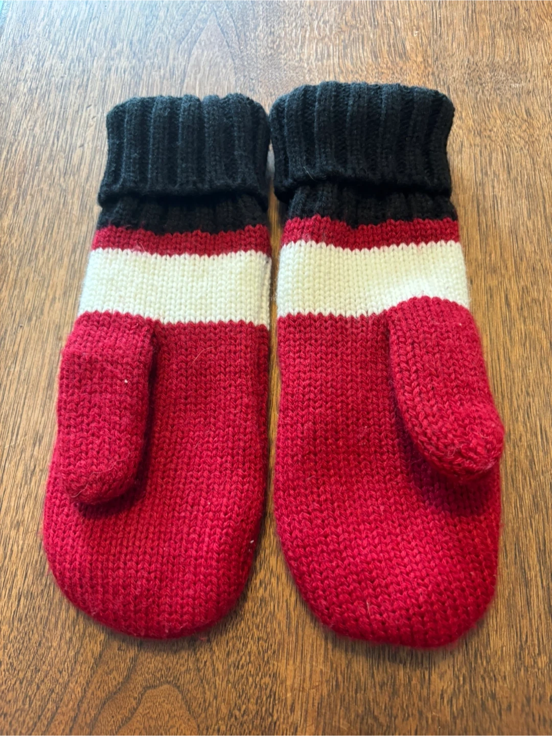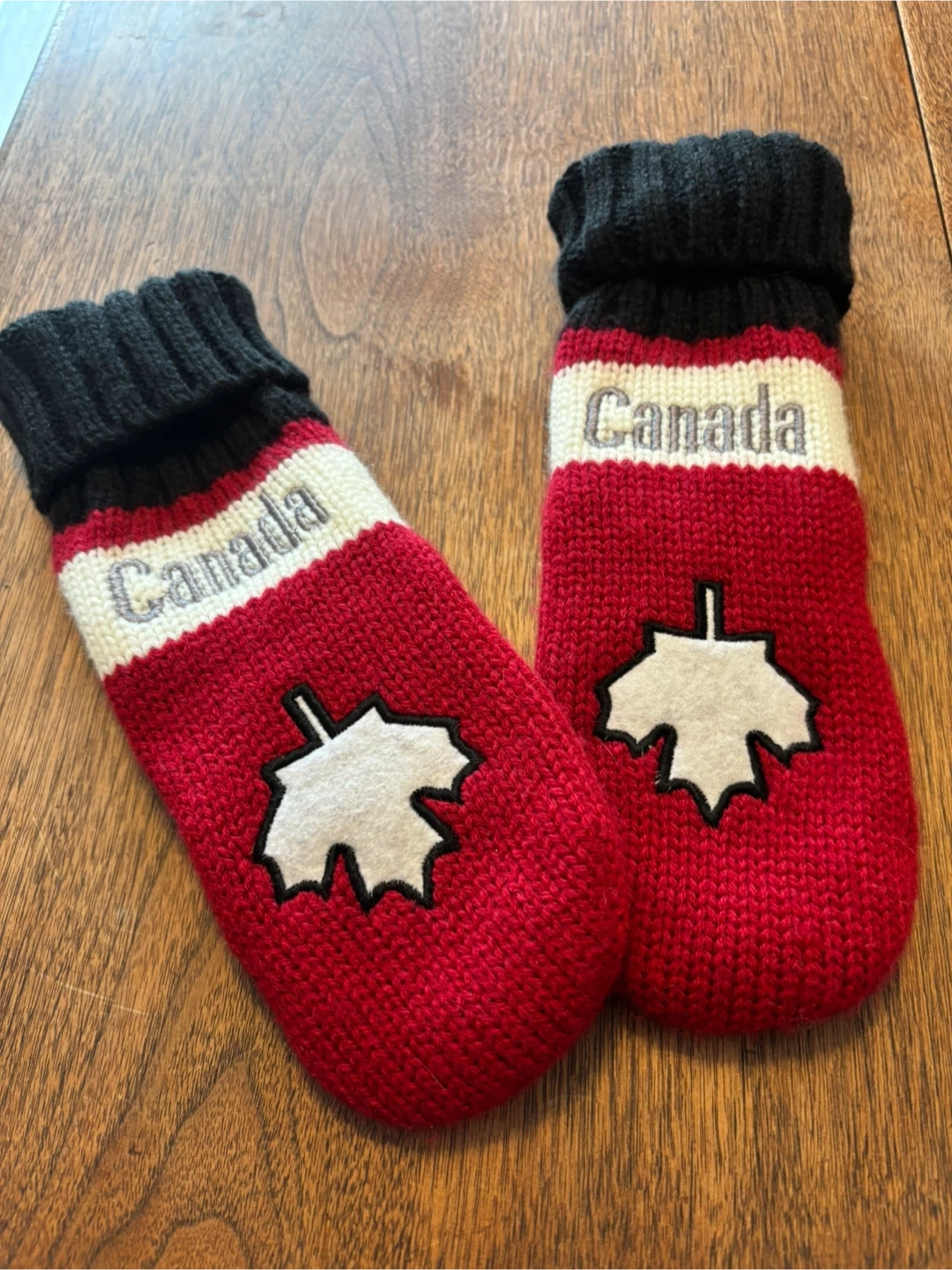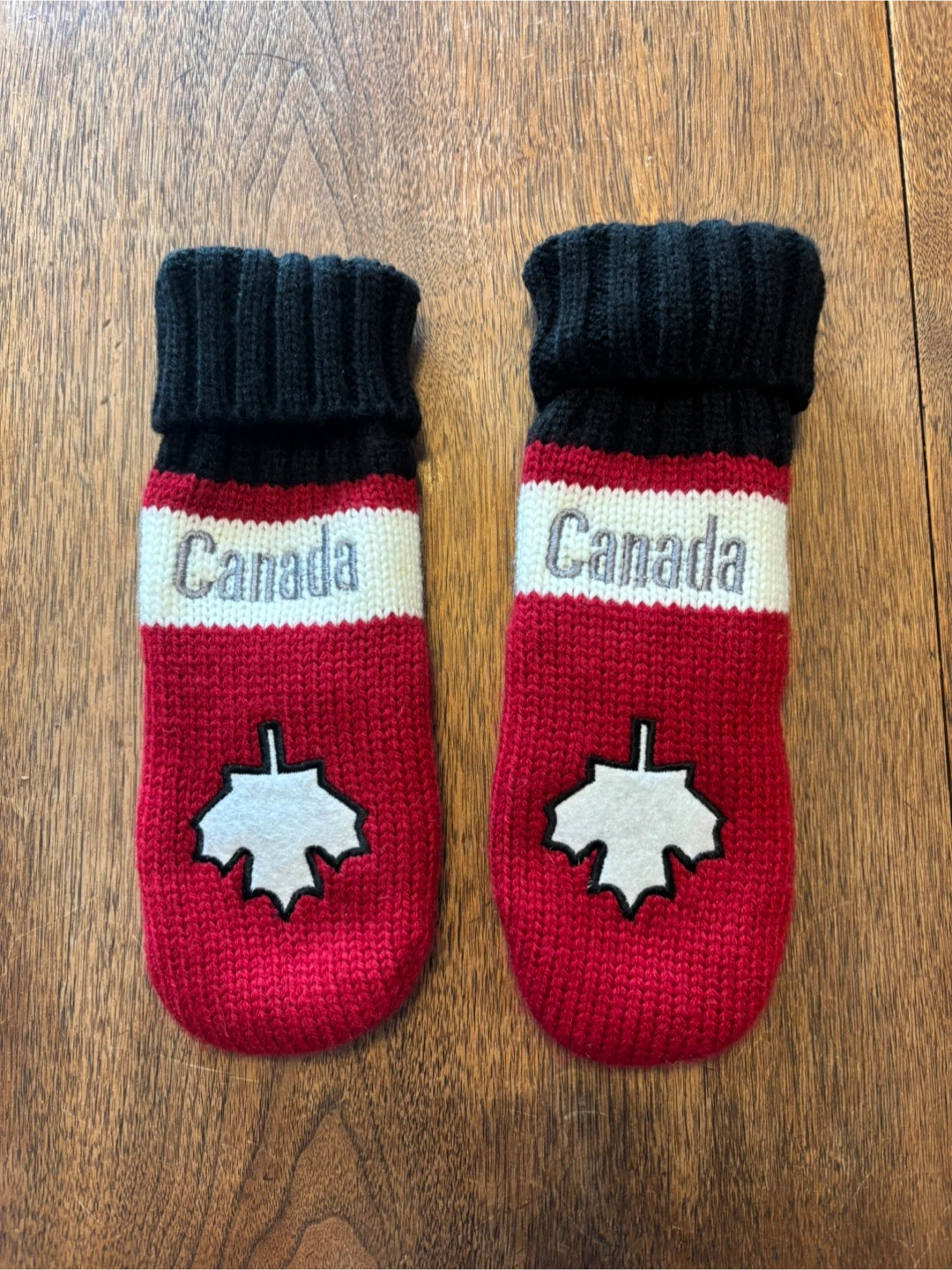 Keep your hands warm with these cozy knit mittens! They feature a classic Canadian design with a maple leaf and the word "Canada". The mittens are red, black, and white, perfect for showing off your Canadian pride during the colder months. Cash only.