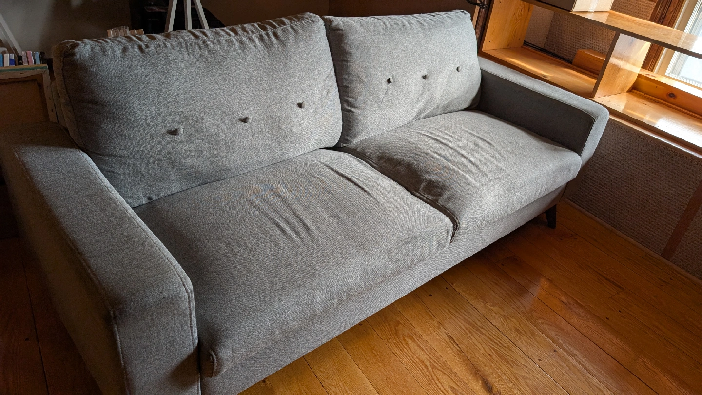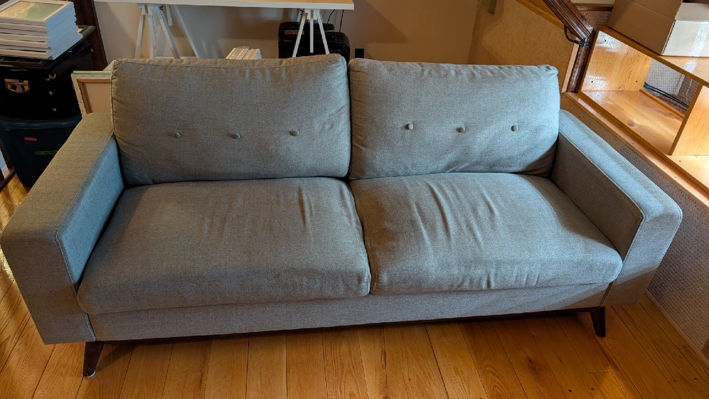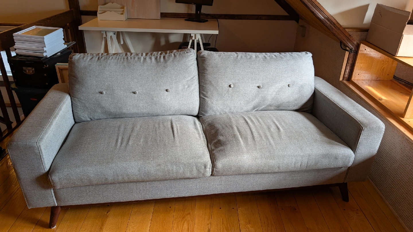This sofa needs a new home :) Here are some details about the sofa: * Style: Modern * Colour: Grey * Material: Fabric * Seating Capacity: 2-3 80 inches long, 32 inches deep and about 30 inches tall. has a water stain on the seat, should be able to get it out easily.