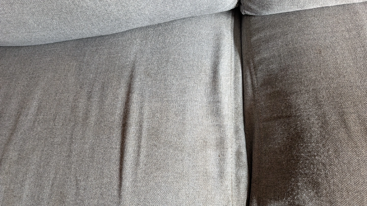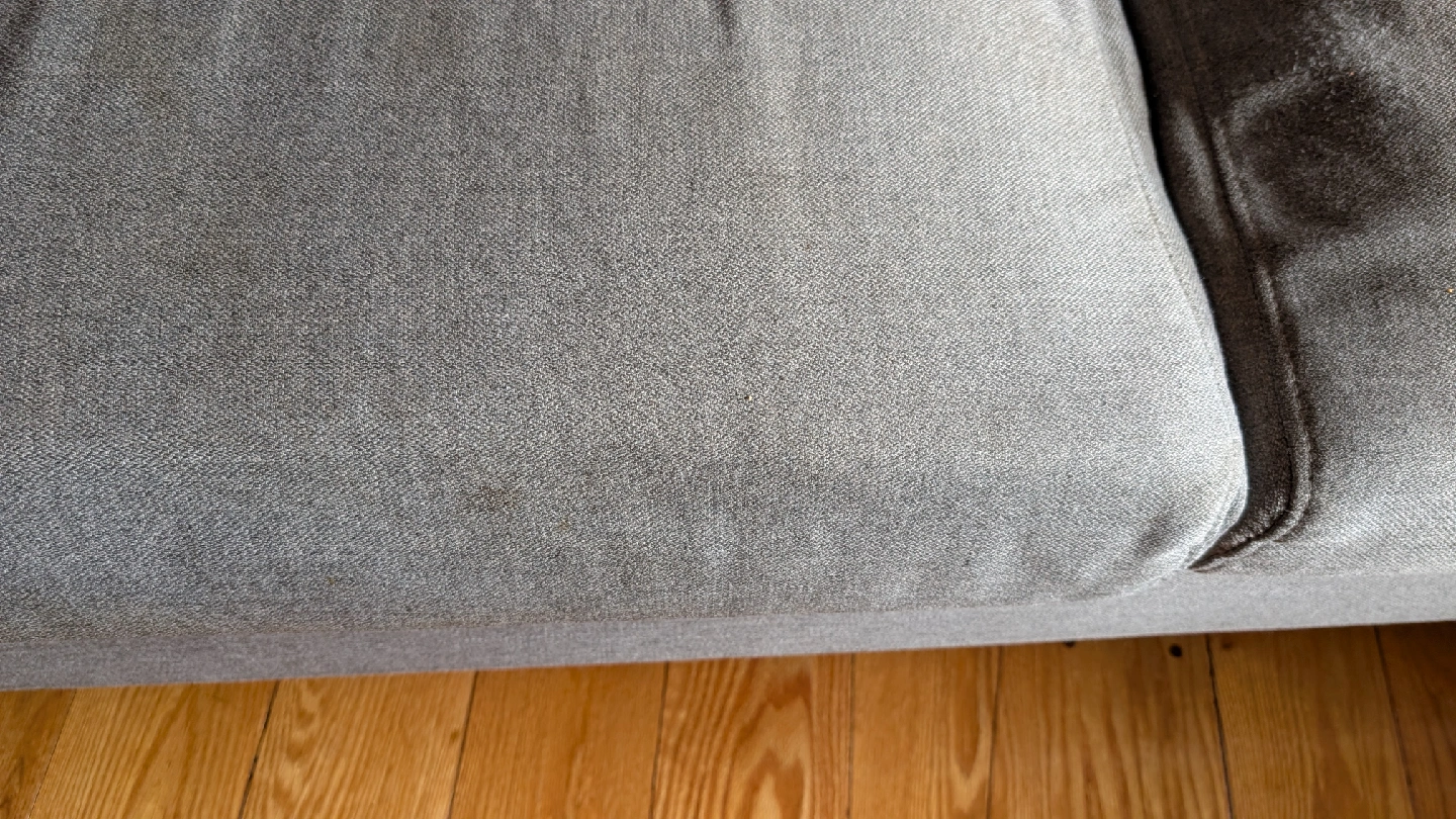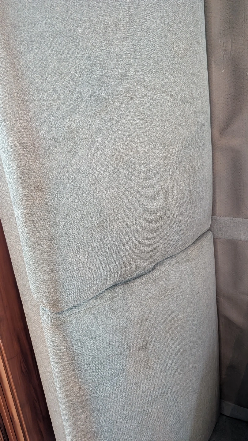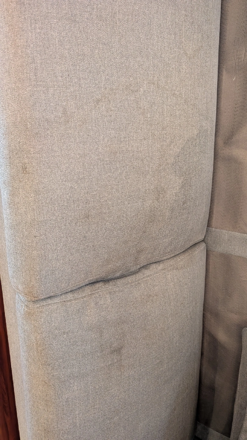 This sofa needs a new home :) Here are some details about the sofa: * Style: Modern * Colour: Grey * Material: Fabric * Seating Capacity: 2-3 80 inches long, 32 inches deep and about 30 inches tall. has a water stain on the seat, should be able to get it out easily.