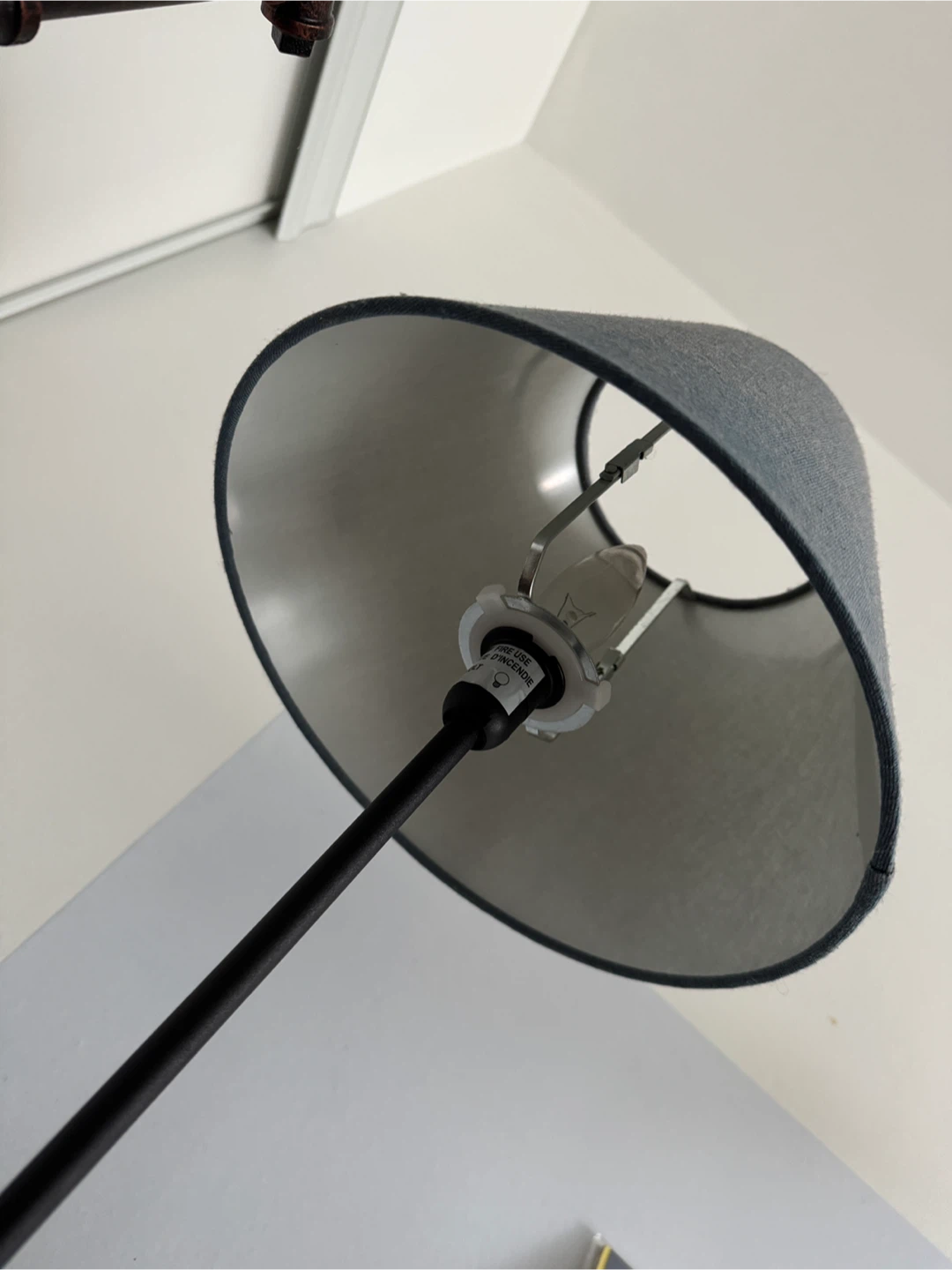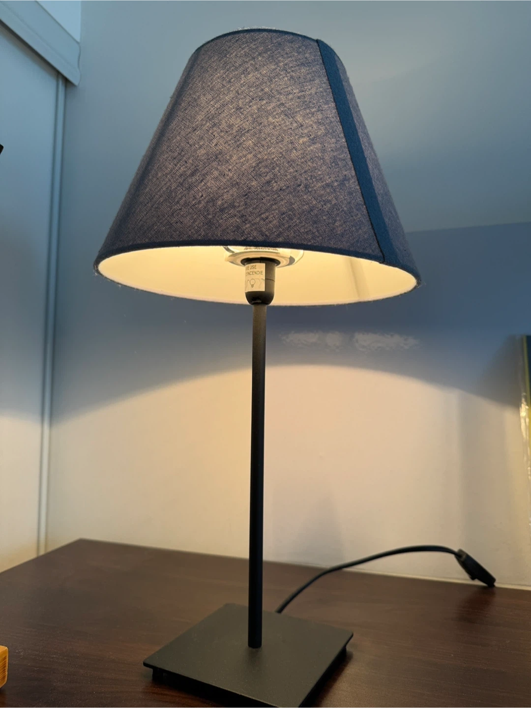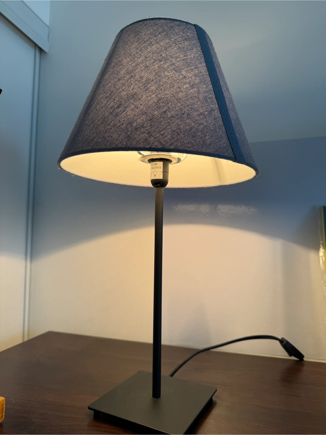 Modern lamp with a sleek black base and a lovely blue shade. It's in great condition and would look perfect on a desk or bedside table
