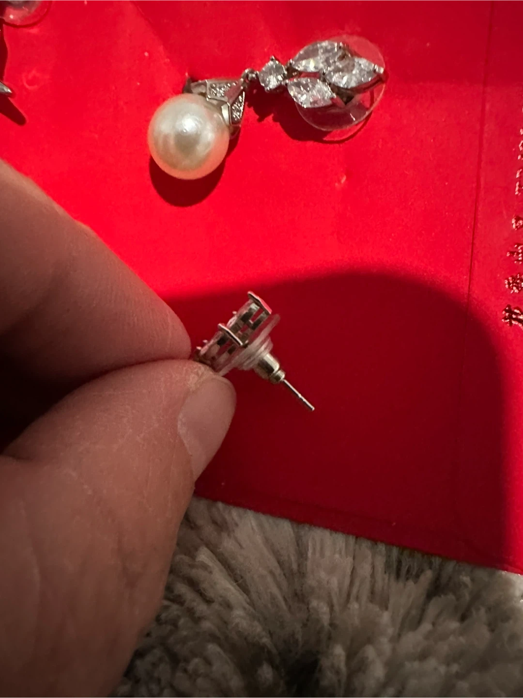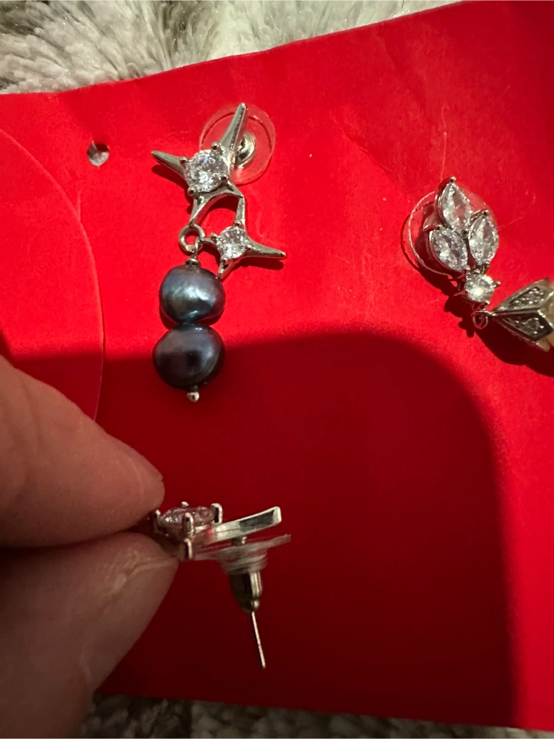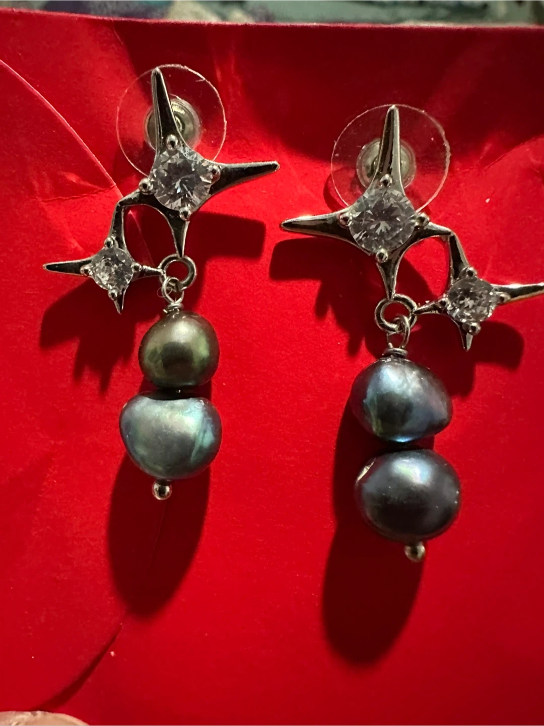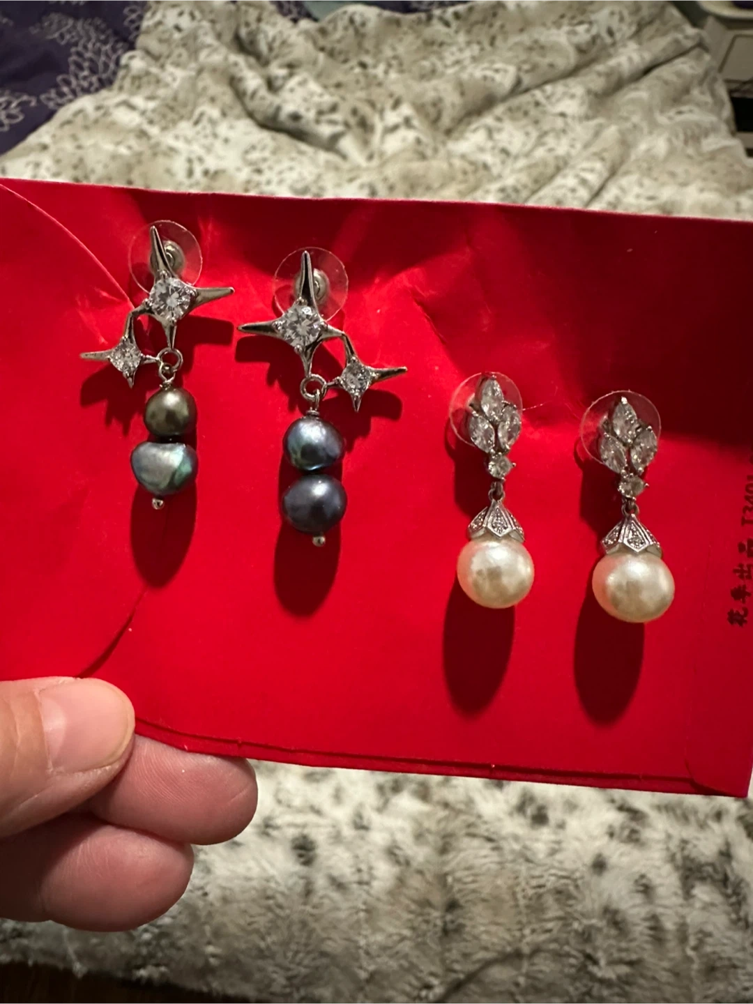 Two pairs of earrings for sale! One pair features grey pearls with a starburst design, and the other pair has classic white pearls with a jeweled top. Both are in great condition and ready for a new home, worn once for a function, no loose or missing stones and both have been cleaned with alcohol wipes. Smoke free home.