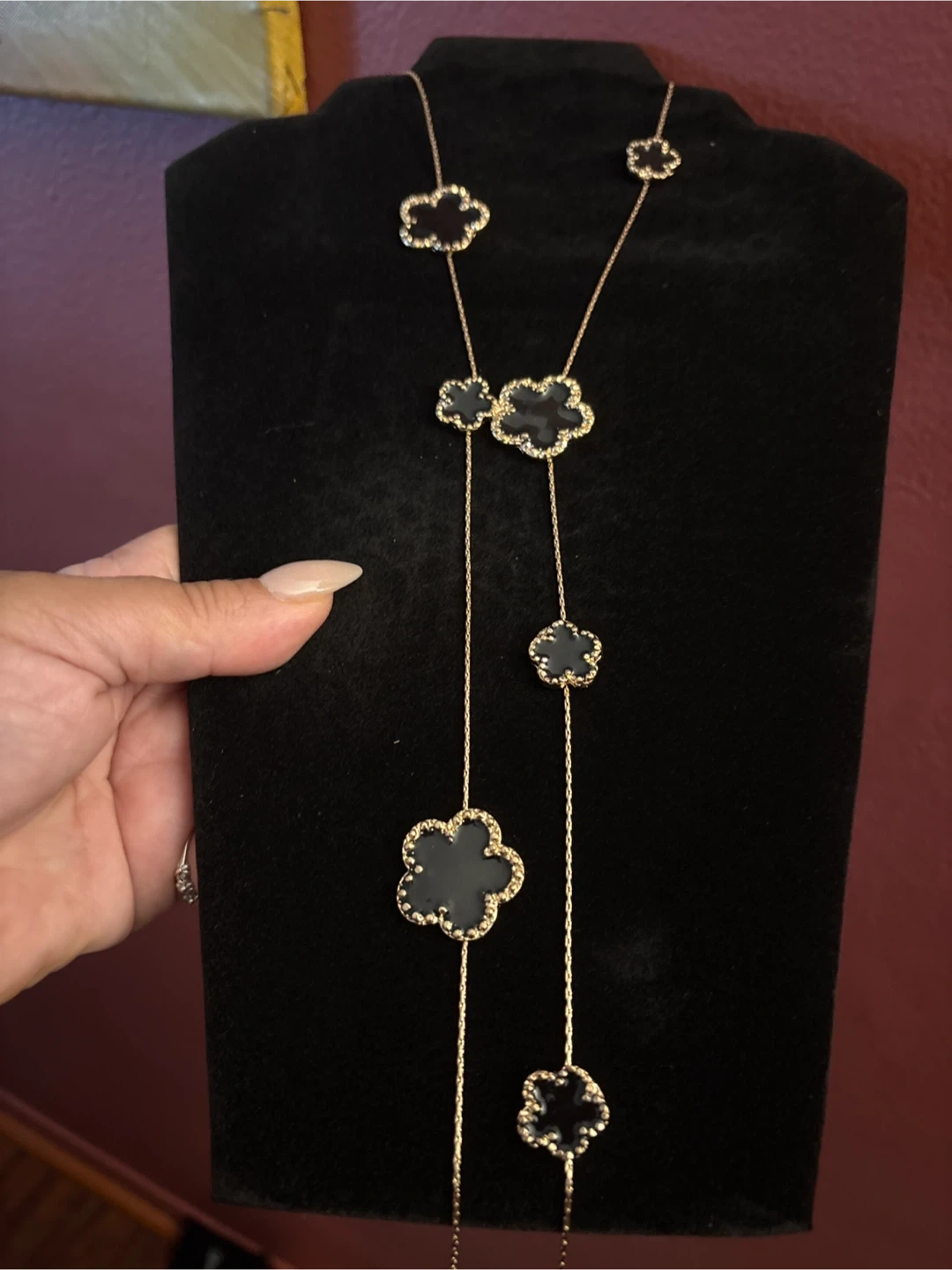 Selling a beautiful Alhambra long necklace! It features the iconic clover motif in black onyx and18 K gold stainless steel necklace . This necklace is in excellent condition and ready to add a touch of elegance to your style New comes with box pouch and cleaning cloth