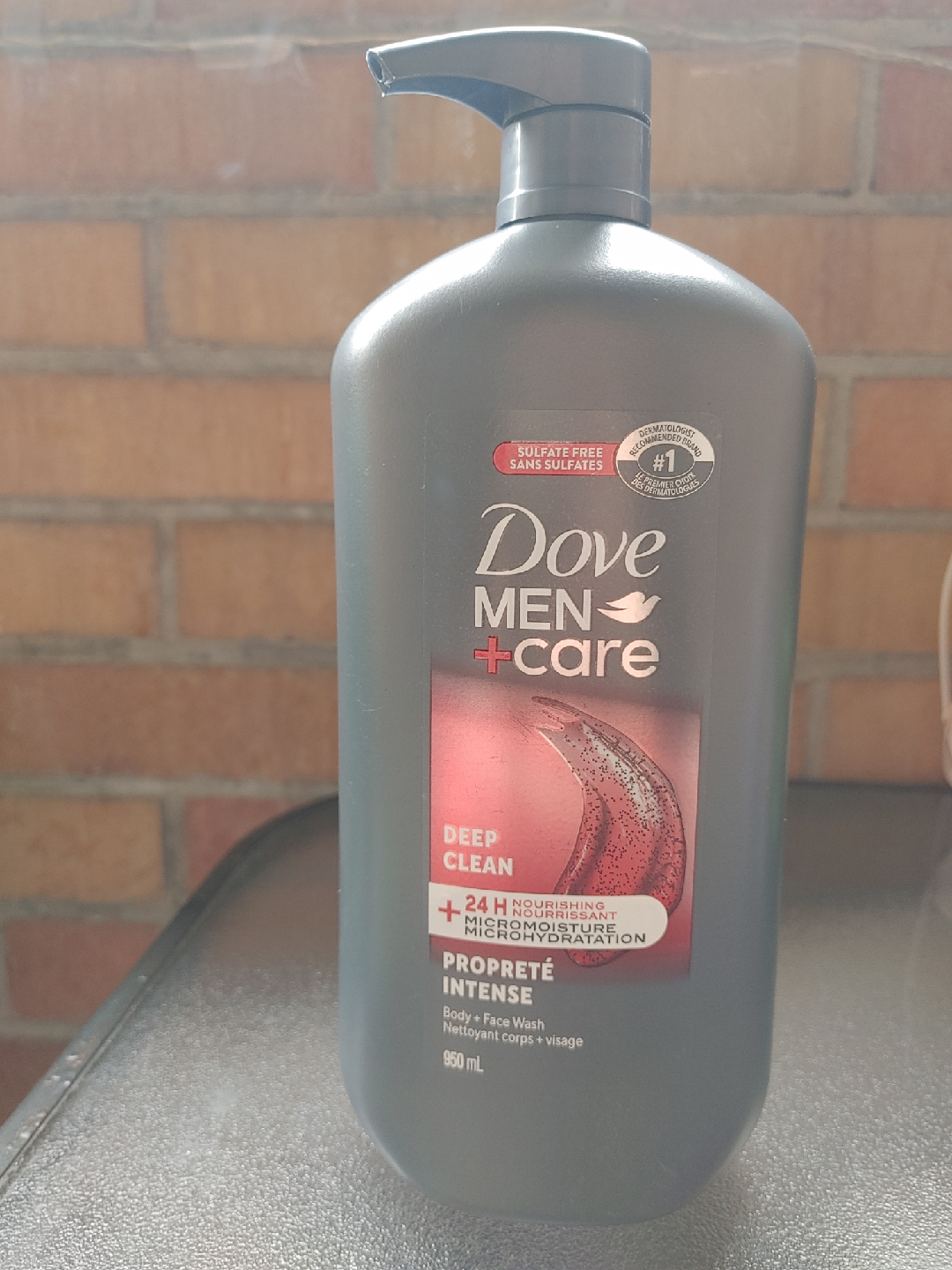 Selling a bottle of Dove Men+Care Deep Clean Body + Face Wash! This is a 950mL bottle, perfect for keeping your skin feeling refreshed and clean. It provides 24 hours of nourishing micromoisture. It's also sulfate-free!