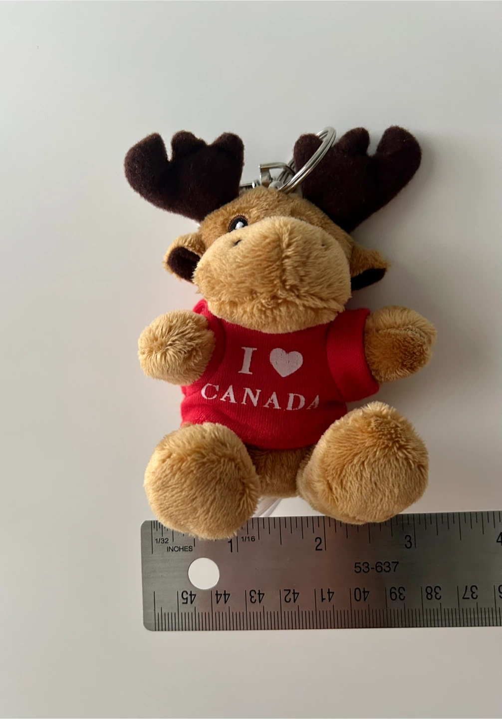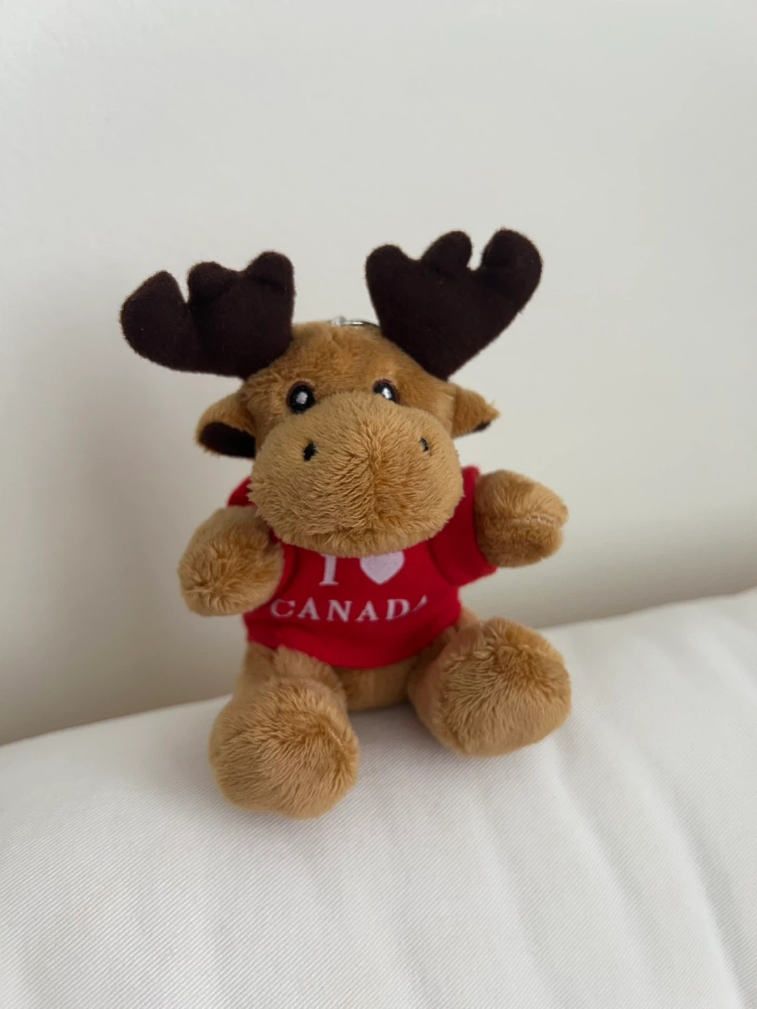 Super cute moose plush keychain wearing an "I ❤️ Canada" t-shirt! It's in great condition and ready to add some Canadian charm to your keys or bag. Approximately 4 inches tall.