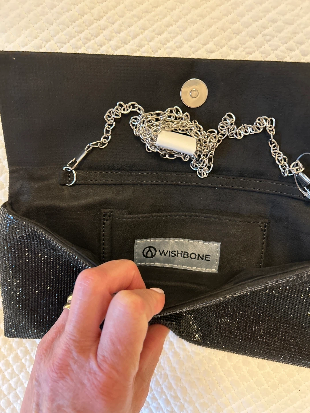 246Selling a stylish black clutch from Wishbone! It's perfect for evenings out or special occasions. The clutch has a sparkly exterior and a chain strap for easy carrying. Originally bought for $128. New with tags.