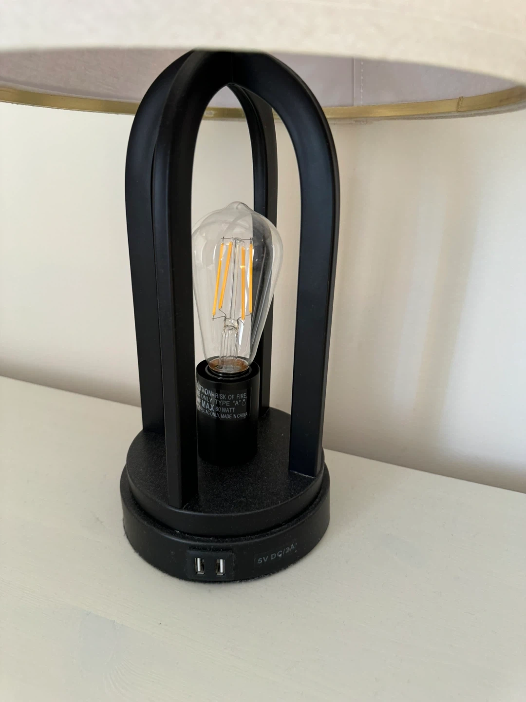 25Here's a stylish table lamp with a neutral-coloured shade and a black base. It features a modern design with an exposed bulb and has convenient USB ports built into the base for charging your devices. Perfect for a bedside table or desk!