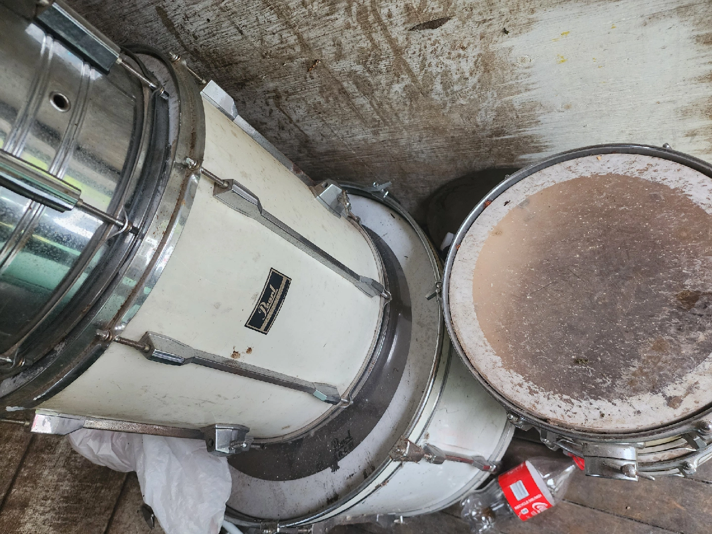 Selling a Pearl drum set. It's a bit worn and could use some cleaning up, but it's still got potential for someone looking for a project or a budget-friendly set to practice on. The heads show wear, and there are some cosmetic blemishes, but the hardware seems functional. Perfect for someone who doesn't mind putting in a little elbow grease!