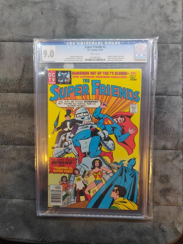 Selling a vintage Super Friends #2 comic book, graded 9.0 by CGC. This comic from D.C. Comics, dated December 1976, features a classic story with Superman and the Super Friends. It's a great addition to any comic book collection!