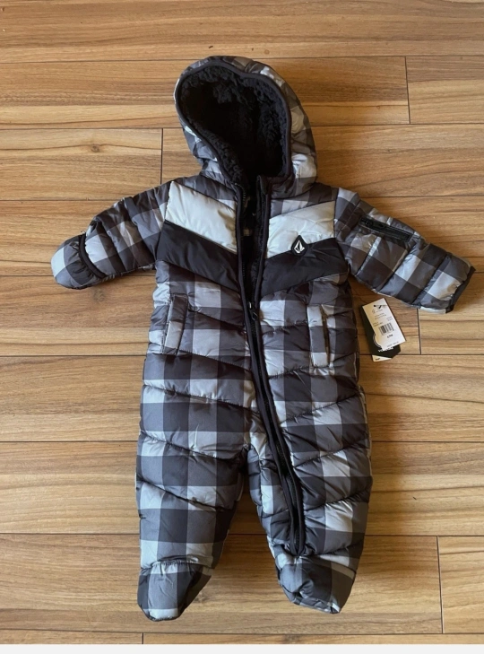 This Volcom baby snowsuit is brand new with tags! It features a stylish gray plaid pattern and is perfect for keeping your little one warm and cozy in the snow