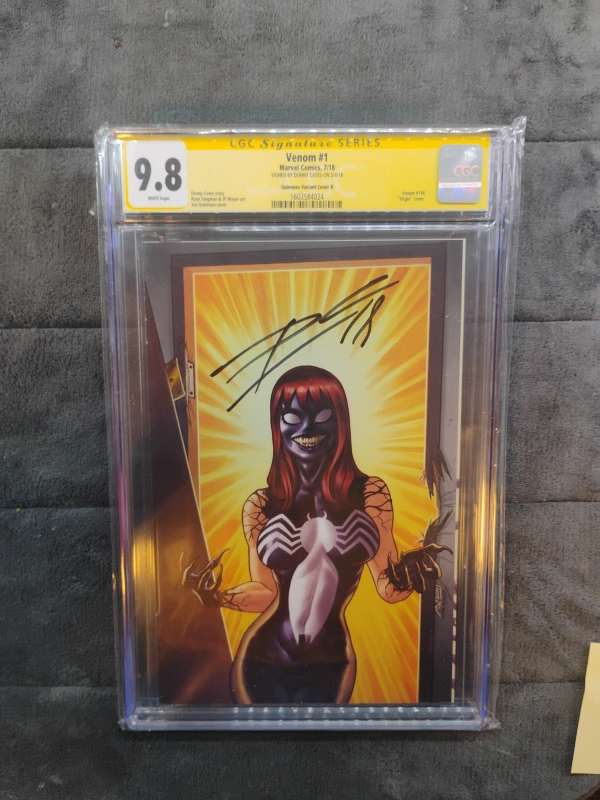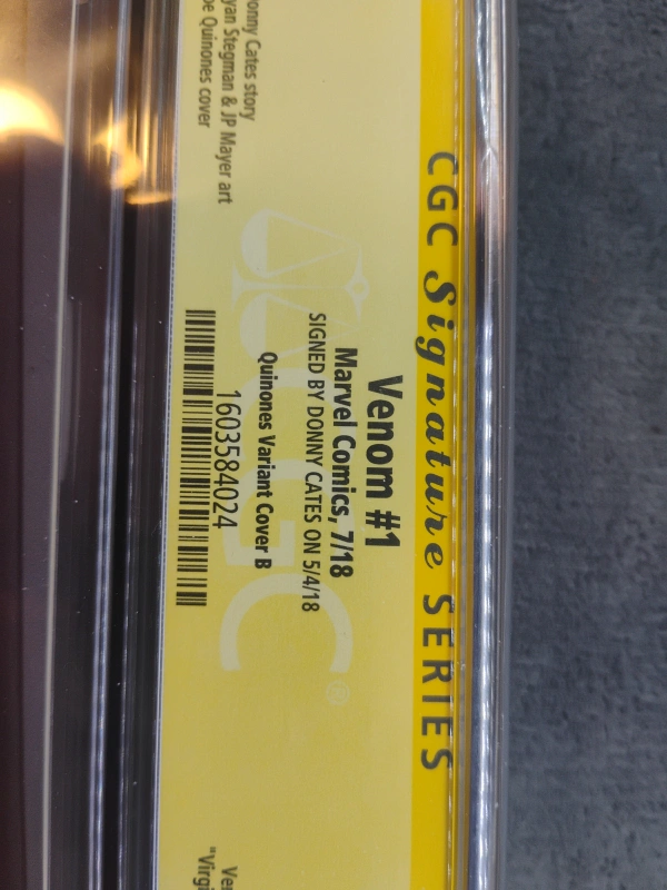 Selling a Venom #1 Marvel Comics comic book, signed by Donny Cates on 5/4/18. It's a Quinones Variant Cover B and has been graded by CGC with a score of 9.8