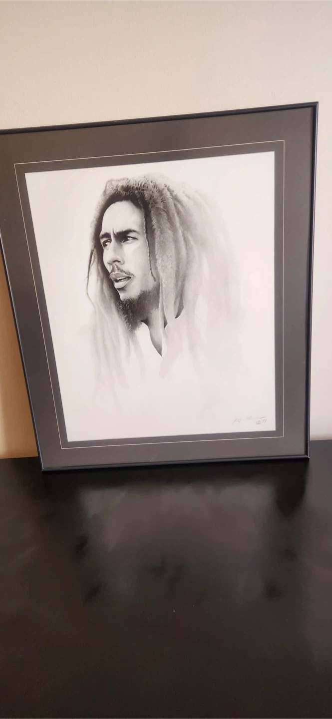 This is a framed drawing of Bob Marley. It was purchased from The Lane Gallery at 2563 Major Mackenzie Drive, Unit #7, Maple, Ontario L6A 2E5