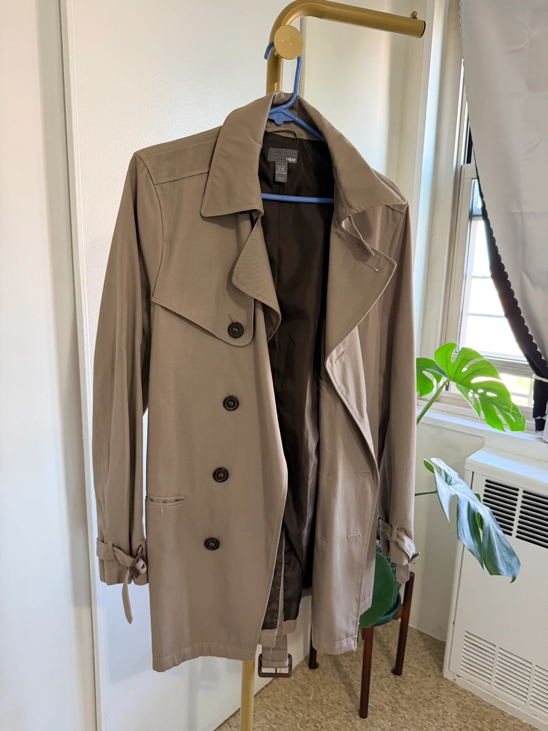 Selling a stylish beige trench coat from H&M! It's a size small and in great condition. Perfect for layering and adding a touch of elegance to any outfit.