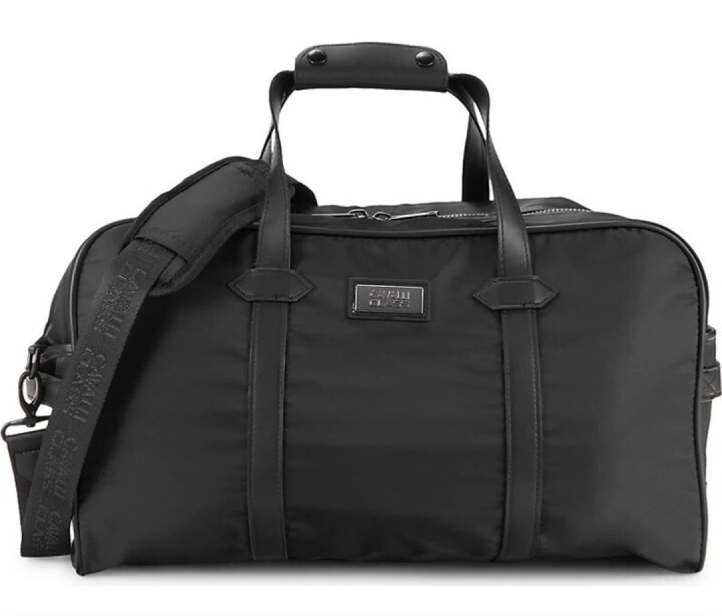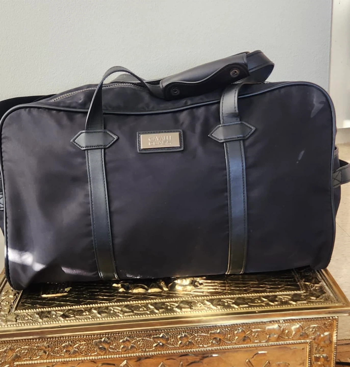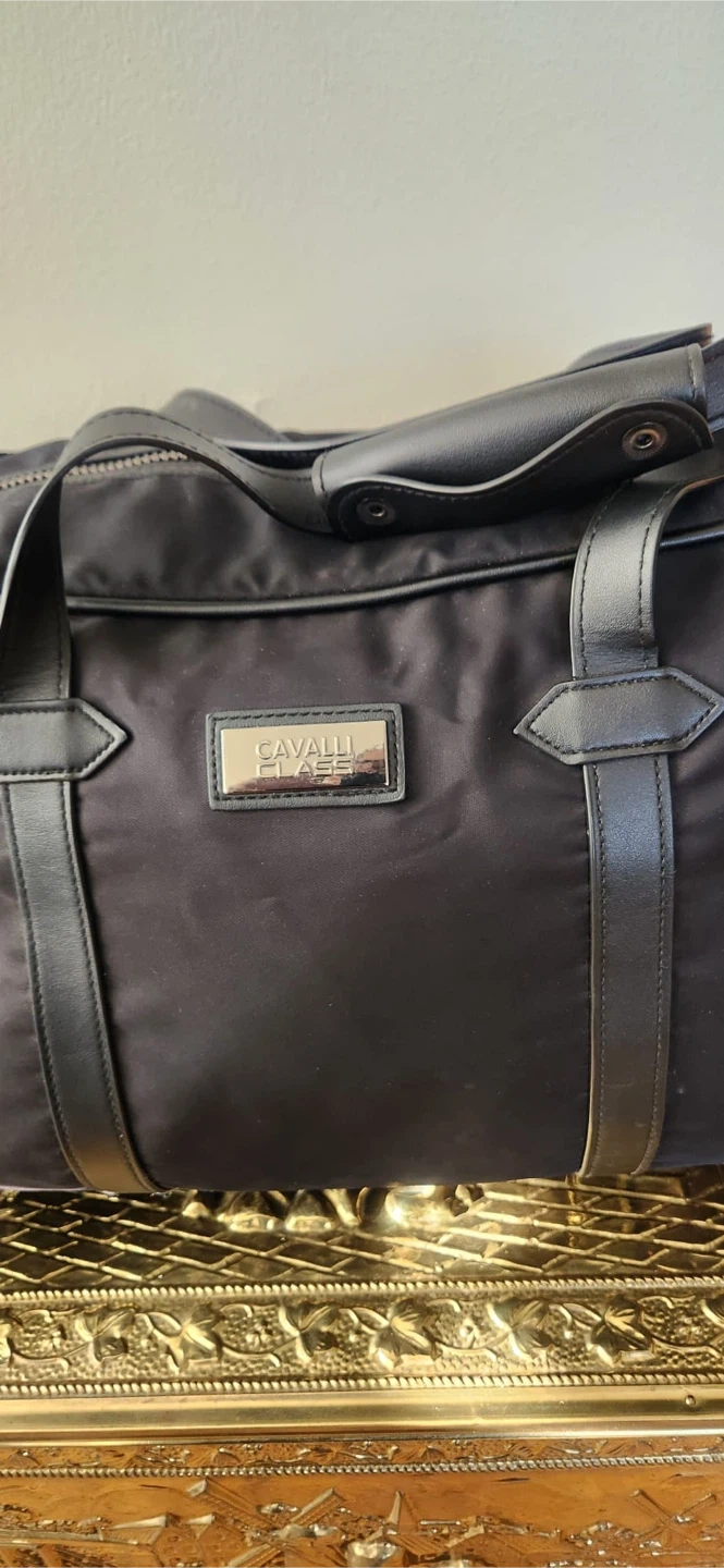 Selling a Cavalli Class duffle bag in black. It's in great shape and perfect for travel or the gym. The bag features leather accents and a detachable shoulder strap. Stylish and functional!